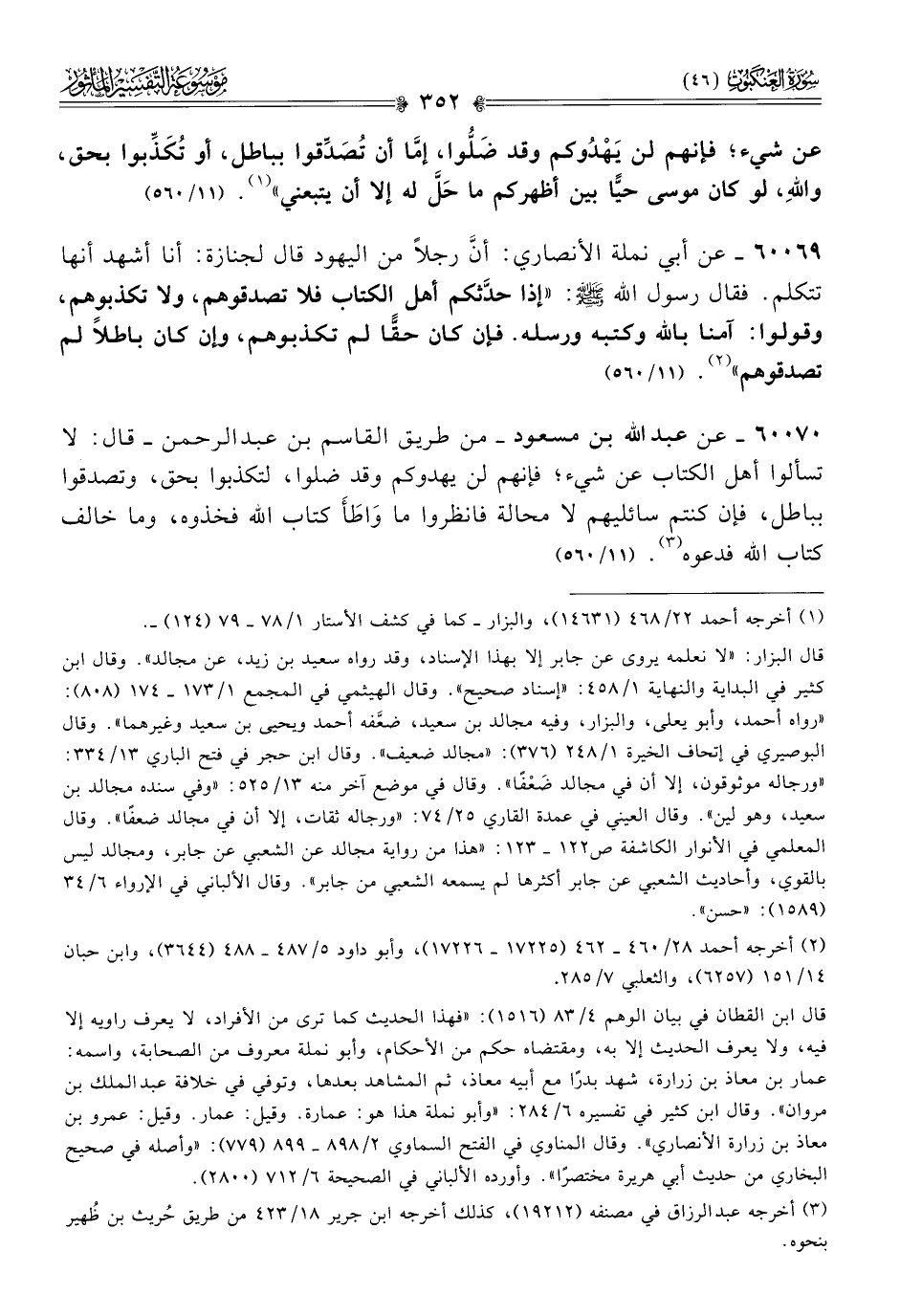 ٦٠٠٦٩ - عن أبي نملة الأنصاري: أنّ رجلًا من اليهود قال لجنازة: أنا أشهد أنها تتكلم. فقال رسول الله - صلى الله عليه وسلم -: «إذا حدَّثكم أهل الكتاب فلا تصدقوهم، ولا تكذبوهم، وقولوا: آمنا بالله وكتبه ورسله. فإن كان حقًّا لم تكذبوهم، وإن كان باطلًا لم تصدقوهم» (¬٢). (١١/ ٥٦٠)