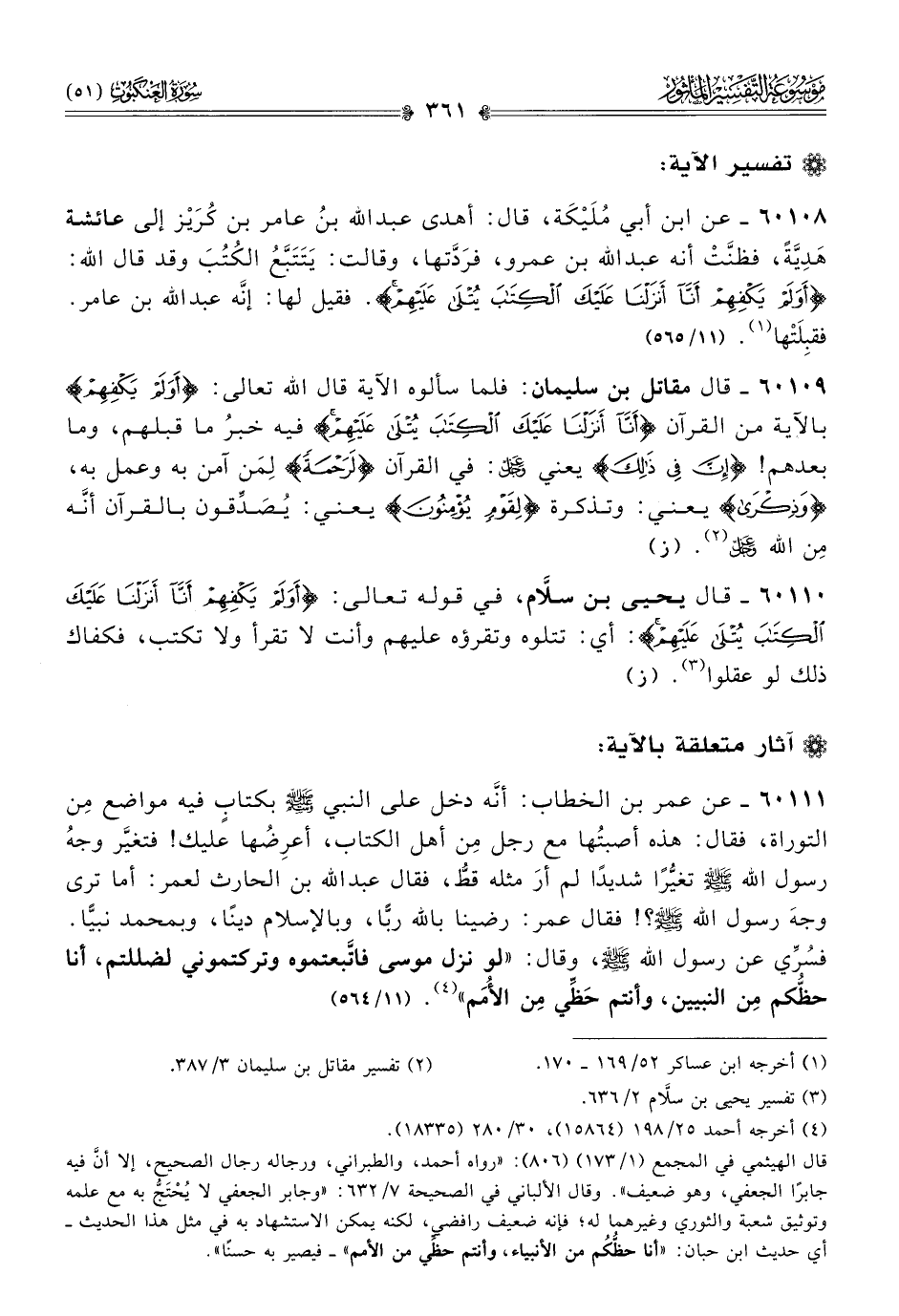 ٦٠١٠٨ - عن ابن أبي مُلَيْكَة، قال: أهدى عبدُ الله بنُ عامر بن كُرَيْز إلى عائشة هَدِيَّةً، فظنَّتْ أنه عبد الله بن عمرو، فرَدَّتها، وقالت: يَتَتَبَّعُ الكُتُبَ وقد قال الله: {أو لم يكفهم أنا أنزلنا عليك الكتاب يتلى عليهم}. فقيل لها: إنّه عبد الله بن عامر. فقبِلَتْها (¬١). (١١/ ٥٦٥)