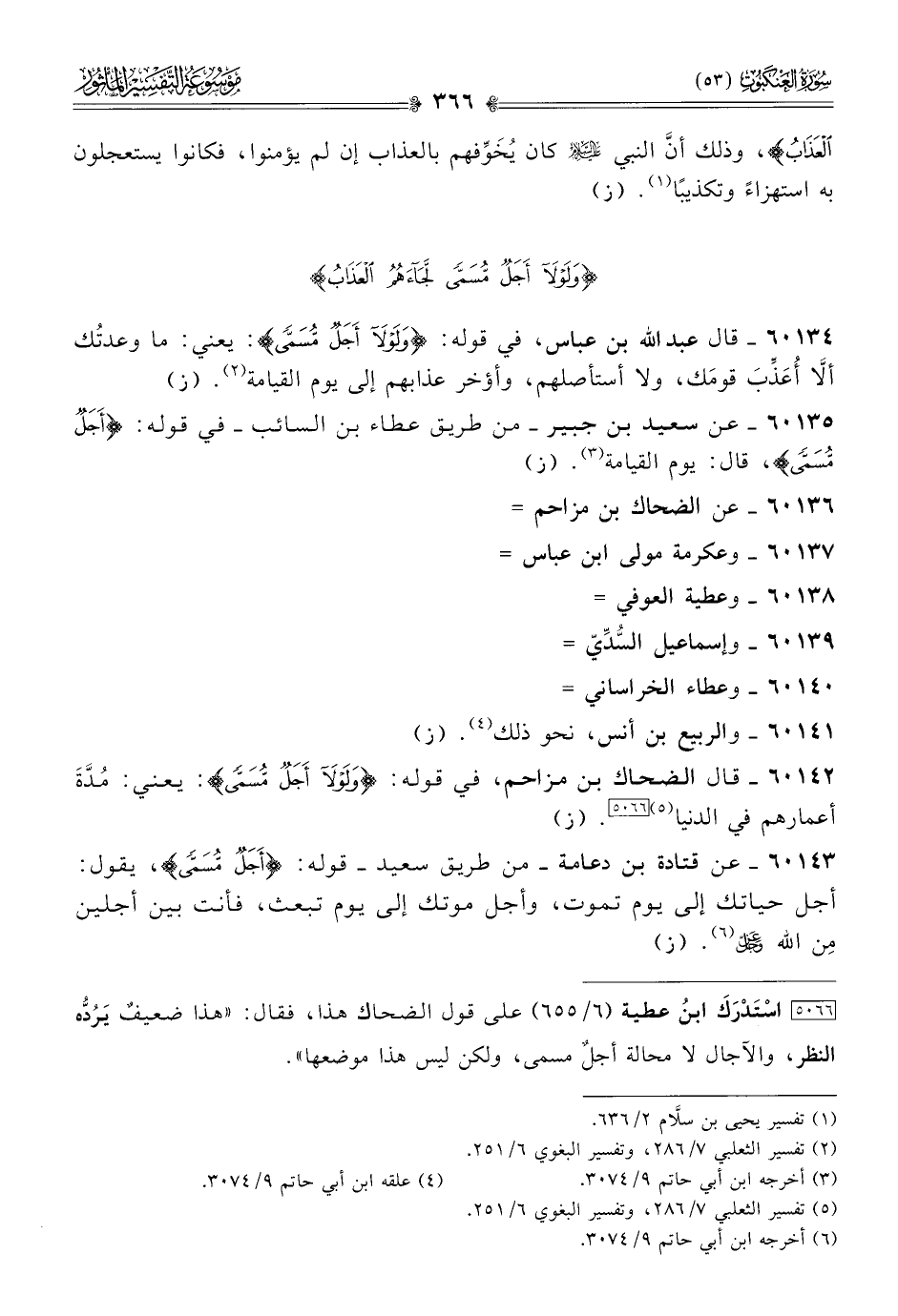 ٦٠١٣٥ - عن سعيد بن جبير -من طريق عطاء بن السائب- في قوله: {أجل مسمى}، قال: يوم القيامة (¬٣). (ز)