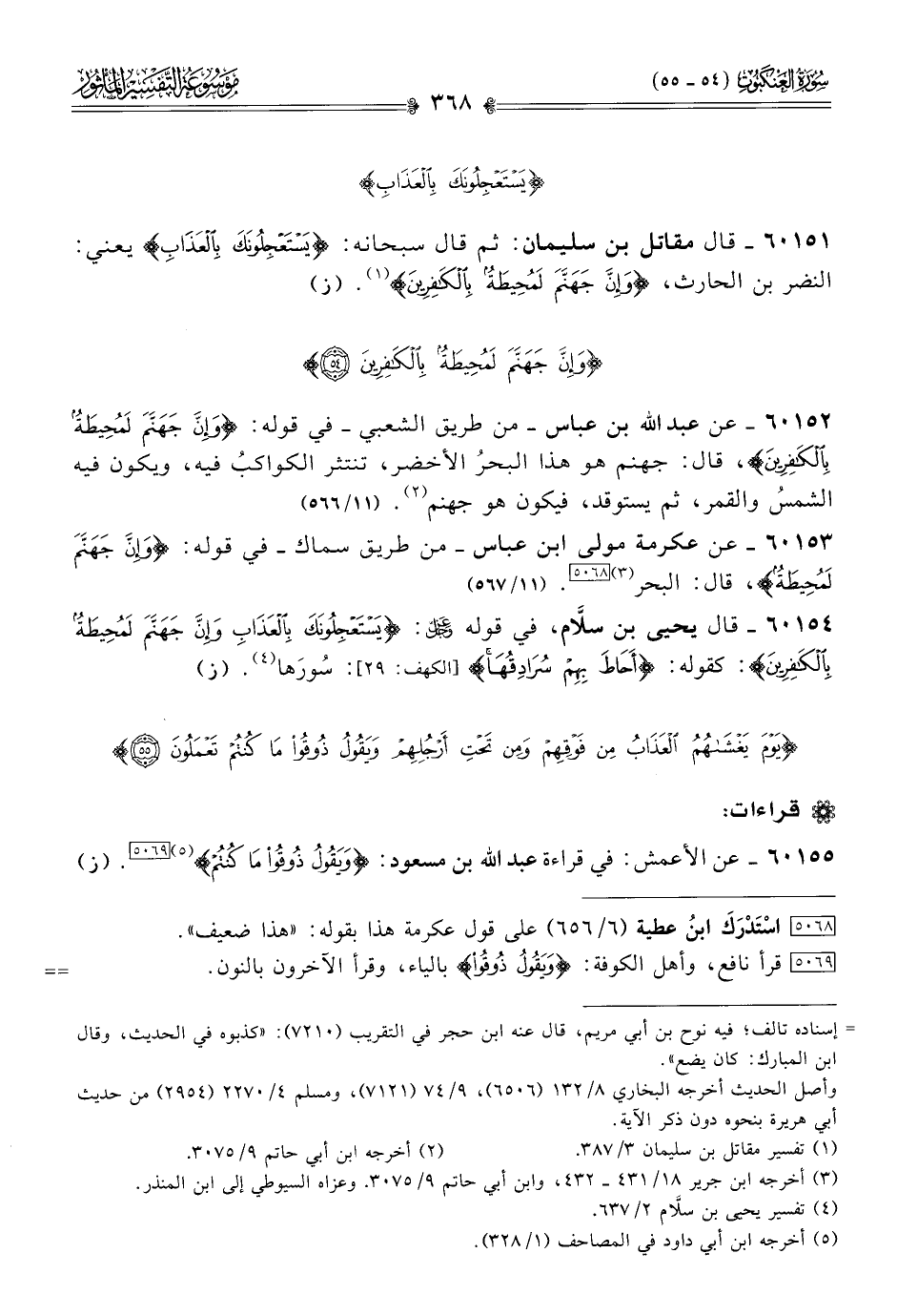 ٦٠١٥٤ - قال يحيى بن سلّام، في قوله - عز وجل -: {يستعجلونك بالعذاب وإن جهنم لمحيطة بالكافرين}: كقوله: {أحاط بهم سرادقها} [الكهف: ٢٩]: سُورَها (¬٤). (ز)