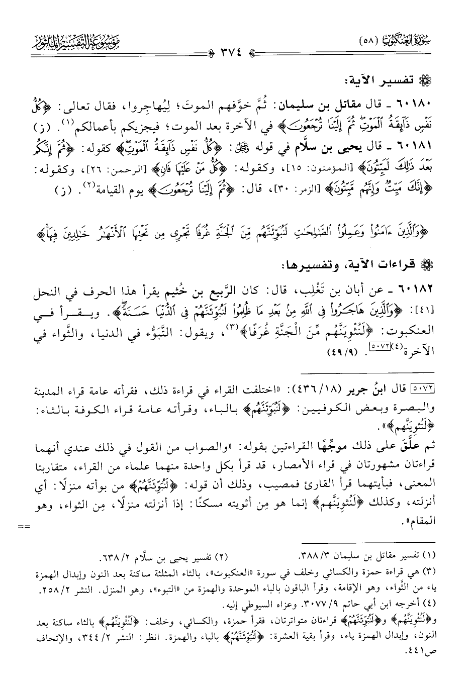 ٦٠١٨٢ - عن أبان بن تَغْلِب، قال: كان الرَّبيع بن خُثيم يقرأ هذا الحرف في النحل [٤١]: {والَّذِينَ هاجَرُواْ فِي اللهِ مِن بَعْدِ ما ظُلِمُواْ لَنُبَوِّئَنَّهُمْ فِي الدُّنْيا حَسَنَةً}. ويقرأ في العنكبوت: «لَنُثْوِيَنَّهُم مِّنَ الجَنَّةِ غُرَفًا» (¬٣)، ويقول: التَّبَوُّء في الدنيا، والثَّواء في الآخرة (¬٤) [٥٠٧٢]. (٩/ ٤٩)