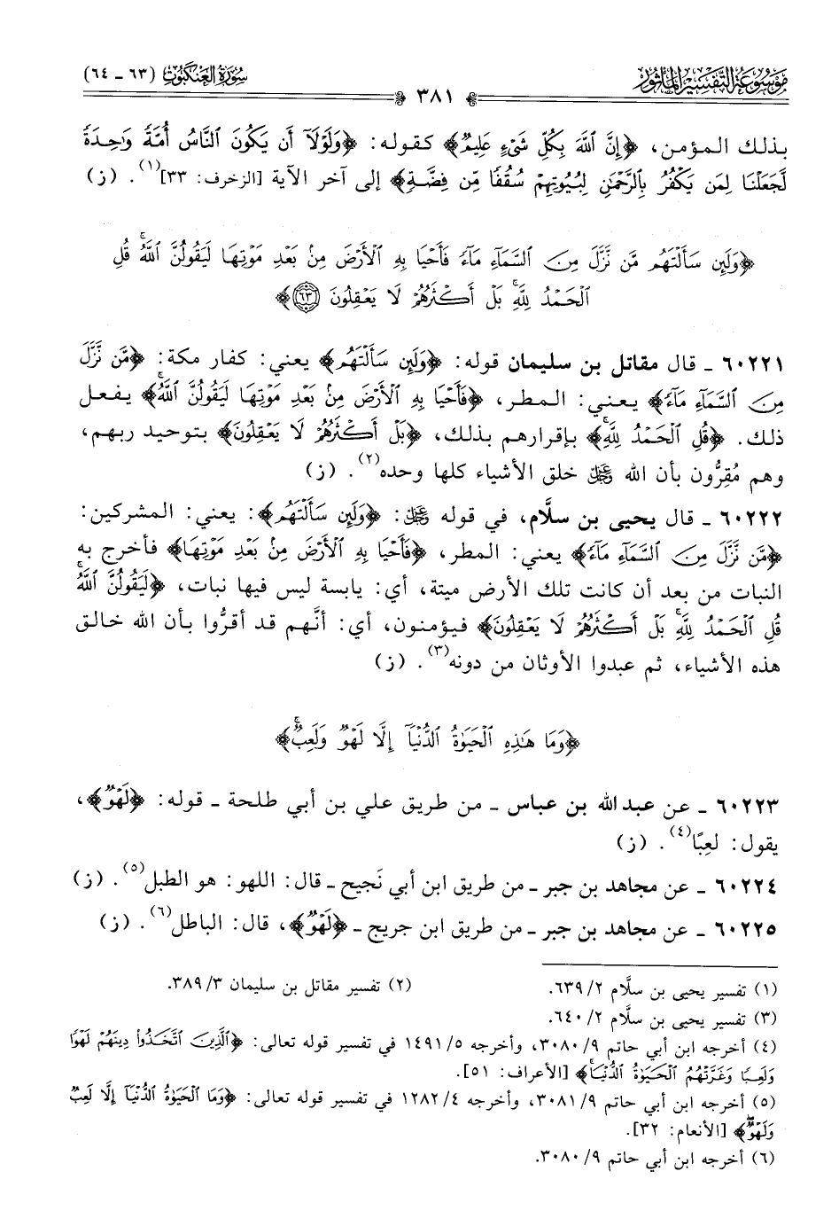 ٦٠٢٢٢ - قال يحيى بن سلّام، في قوله - عز وجل -: {ولئن سألتهم}: يعني: المشركين: {من نزل من السماء ماء} يعني: المطر، {فأحيا به الأرض من بعد موتها} فأخرج به النبات من بعد أن كانت تلك الأرض ميتة، أي: يابسة ليس فيها نبات، {ليقولن الله قل الحمد لله بل أكثرهم لا يعقلون} فيؤمنون، أي: أنّهم قد أقرُّوا بأن الله خالق هذه الأشياء، ثم عبدوا الأوثان من دونه (¬٣). (ز)