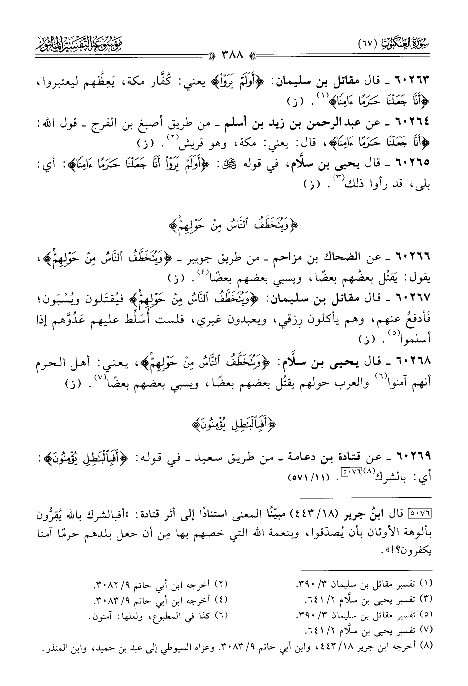٦٠٢٦٨ - قال يحيى بن سلّام: {ويتخطف الناس من حولهم}، يعني: أهل الحرم أنهم آمنوا (¬٦) والعرب حولهم يقتُل بعضهم بعضًا، ويسبي بعضهم بعضًا (¬٧). (ز)