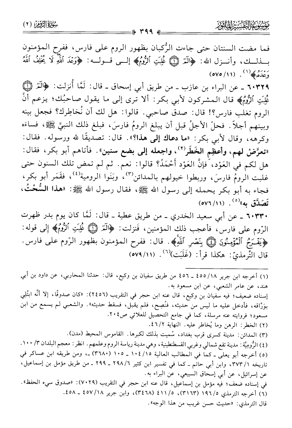 ٦٠٣٣٠ - عن أبي سعيد الخدري -من طريق عطية- قال: لَمّا كان يوم بدر ظهرت الرّوم على فارس، فأعجب ذلك المؤمنين، فَنزلت: {الم *غُلِبَتِ الرُّومُ} إلى قوله: {يفرح المُؤْمِنُونَ * بنصر الله}. قال: ففرح المؤمنون بظهور الرّوم على فارس. قال التِّرمذيّ: هكذا قرأ: (غَلَبَت) (¬٦). (١١/ ٥٧٩)
