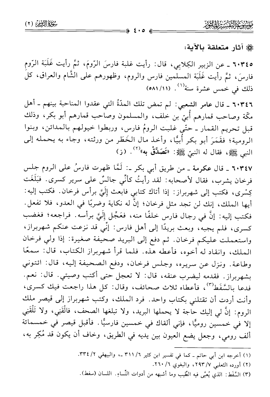 ٦٠٣٤٥ - عن الزبير الكِلابِي، قال: رأيت غلبة فارسَ الرّومَ، ثمَّ رأيت غَلَبَة الرّومِ فارسَ، ثمَّ رأيت غَلَبَة المسلمين فارس والروم، وظهورهم على الشّام والعراق، كل ذلك في خمس عشرة سنة (¬١). (١١/ ٥٨١)