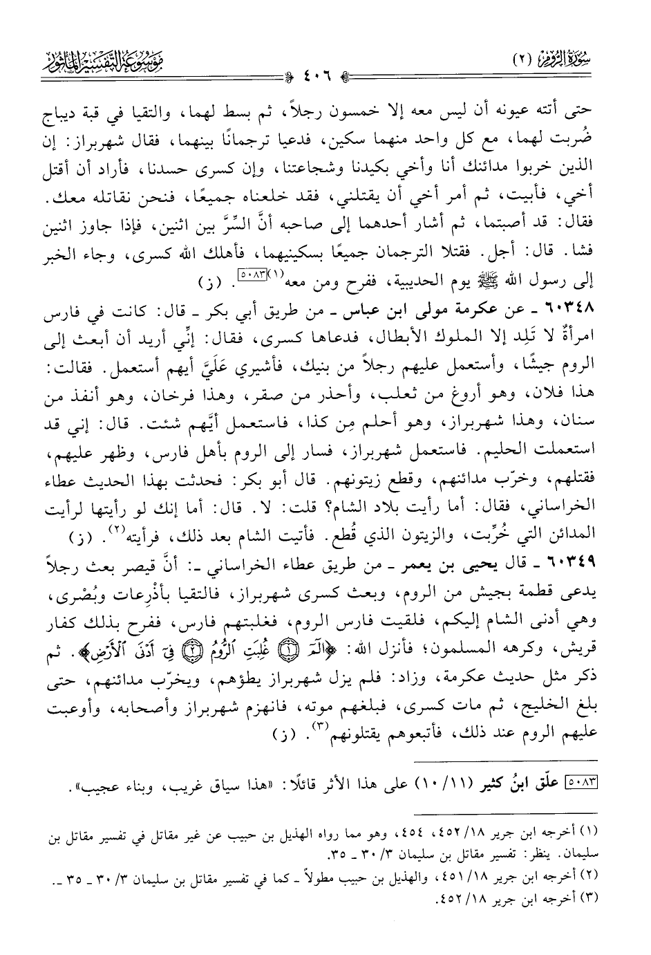 ٦٠٣٤٩ - قال يحيى بن يعمر -من طريق عطاء الخراساني-: أنّ قيصر بعث رجلًا يدعى قطمة بجيش من الروم، وبعث كسرى شهربراز، فالتقيا بأذْرِعات وبُصْرى، وهي أدنى الشام إليكم، فلقيت فارس الروم، فغلبتهم فارس، ففرح بذلك كفار قريش، وكرهه المسلمون؛ فأنزل الله: {الم * غُلِبَتِ الرُّومُ * في أدْنى الأَرْضِ}. ثم ذكر مثل حديث عكرمة، وزاد: فلم يزل شهربراز يطؤهم، ويخرّب مدائنهم، حتى بلغ الخليج، ثم مات كسرى، فبلغهم موته، فانهزم شهربراز وأصحابه، وأوعبت عليهم الروم عند ذلك، فأتبعوهم يقتلونهم (¬٣).