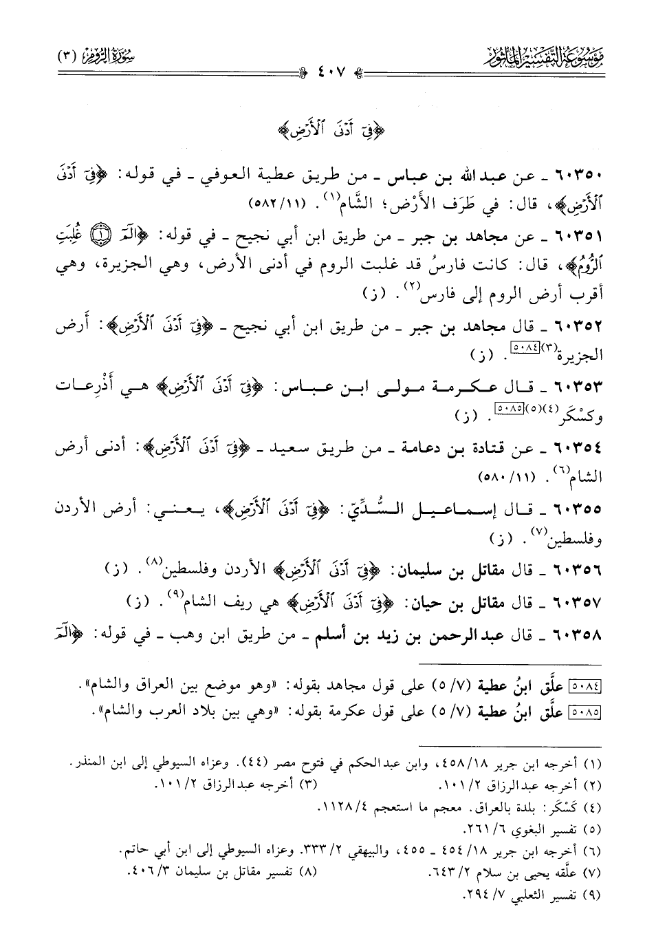 ٦٠٣٥٢ - قال مجاهد بن جبر -من طريق ابن أبي نجيح- {فِي أدْنى الأَرْضِ}: أرض الجزيرة (¬٣) [٥٠٨٤]. (ز)