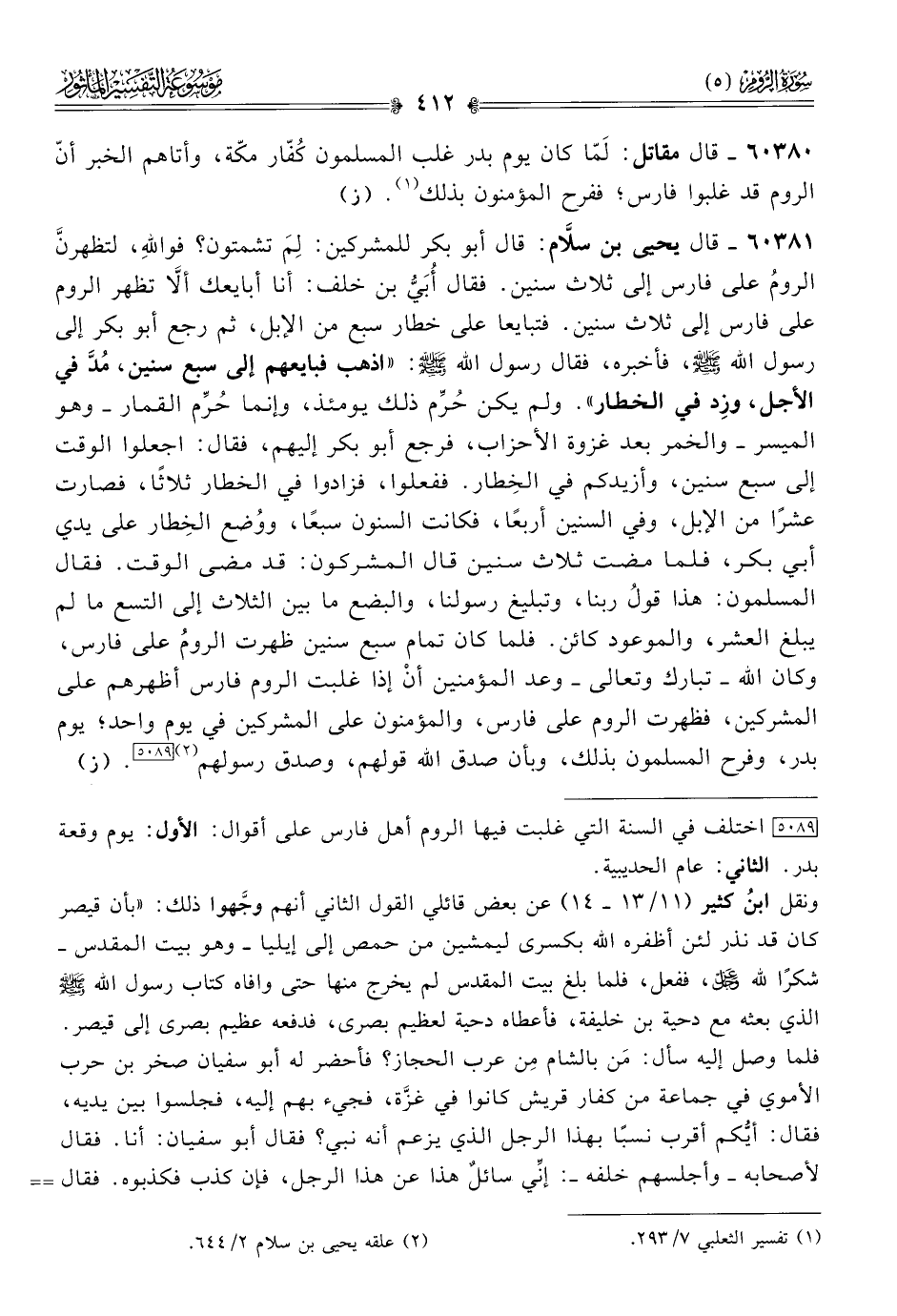٦٠٣٨١ - قال يحيى بن سلّام: قال أبو بكر للمشركين: لِمَ تشمتون؟ فواللهِ، لتظهرنَّ الرومُ على فارس إلى ثلاث سنين. فقال أُبَيُّ بن خلف: أنا أبايعك ألّا تظهر الروم على فارس إلى ثلاث سنين. فتبايعا على خطار سبع من الإبل، ثم رجع أبو بكر إلى رسول الله - صلى الله عليه وسلم -، فأخبره، فقال رسول الله - صلى الله عليه وسلم -: «اذهب فبايعهم إلى سبع سنين، مُدَّ في الأجل، وزِد في الخطار». ولم يكن حُرِّم ذلك يومئذ، وإنما حُرِّم القمار -وهو الميسر- والخمر بعد غزوة الأحزاب، فرجع أبو بكر إليهم، فقال: اجعلوا الوقت إلى سبع سنين، وأزيدكم في الخِطار. ففعلوا، فزادوا في الخطار ثلاثًا، فصارت عشرًا من الإبل، وفي السنين أربعًا، فكانت السنون سبعًا، ووُضع الخِطار على يدي أبي بكر، فلما مضت ثلاث سنين قال المشركون: قد مضى الوقت. فقال المسلمون: هذا قولُ ربنا، وتبليغ رسولنا، والبضع ما بين الثلاث إلى التسع ما لم يبلغ العشر، والموعود كائن. فلما كان تمام سبع سنين ظهرت الرومُ على فارس، وكان الله -تبارك وتعالى- وعد المؤمنين أنْ إذا غلبت الروم فارس أظهرهم على المشركين، فظهرت الروم على فارس، والمؤمنون على المشركين في يوم واحد؛ يوم بدر، وفرح المسلمون بذلك، وبأن صدق الله قولهم، وصدق رسولهم (¬٢) [٥٠٨٩]. (ز)