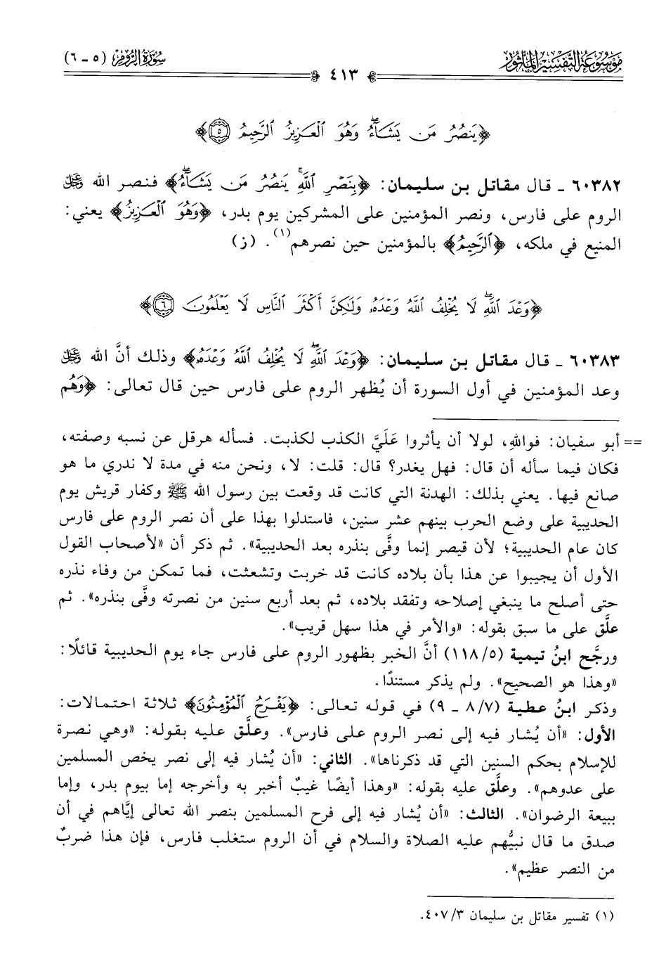 ٦٠٣٨٣ - قال مقاتل بن سليمان: {وعْدَ اللَّهِ لا يُخْلِفُ اللَّهُ وعْدَهُ} وذلك أنّ الله - عز وجل - وعد المؤمنين في أول السورة أن يُظهر الروم على فارس حين قال تعالى: {وهُمْ