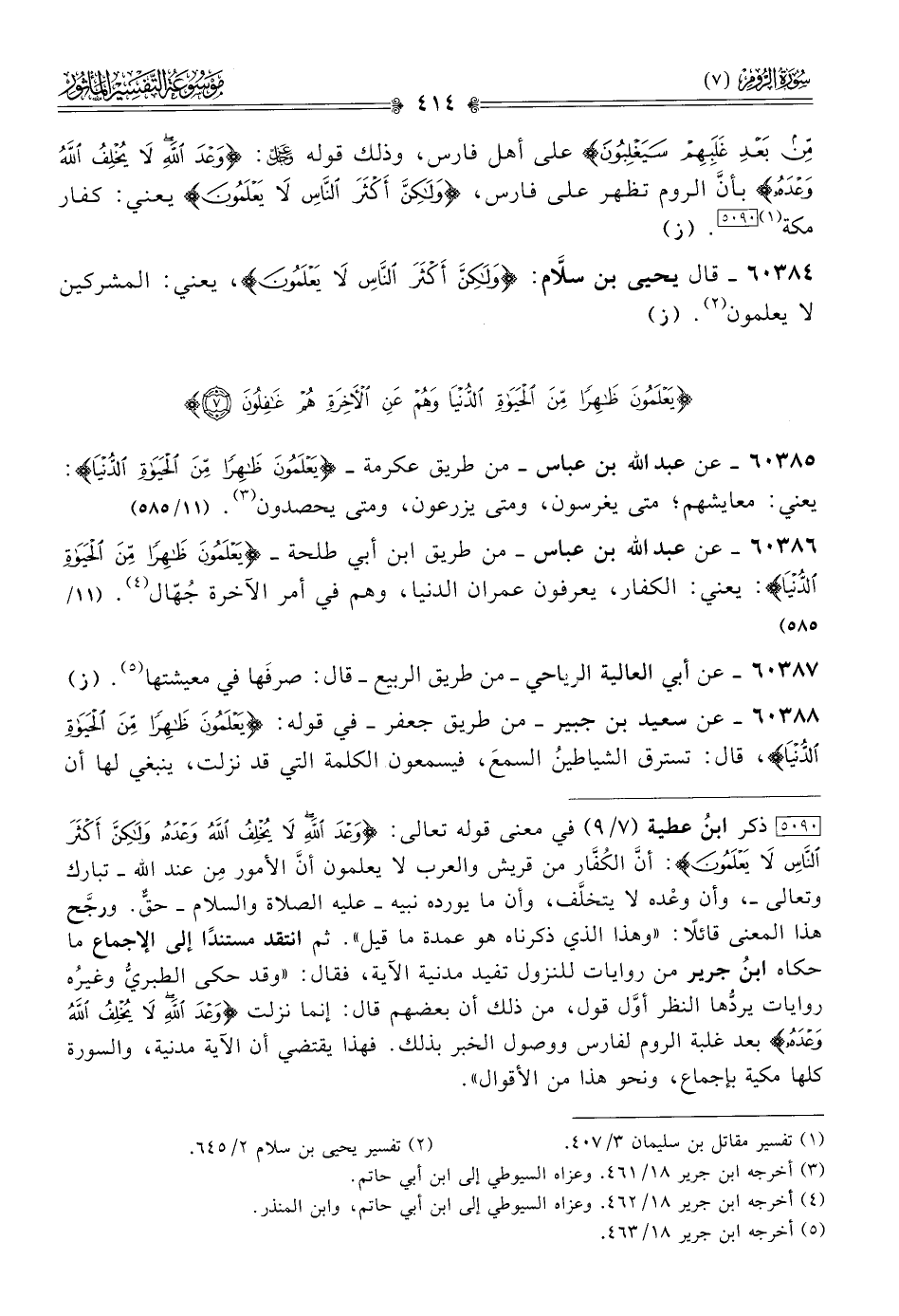 ٦٠٣٨٥ - عن عبد الله بن عباس -من طريق عكرمة- {يَعْلَمُونَ ظاهِرًا مِنَ الحَياةِ الدُّنْيا}: يعني: معايشهم؛ متى يغرسون، ومتى يزرعون، ومتى يحصدون (¬٣). (١١/ ٥٨٥)