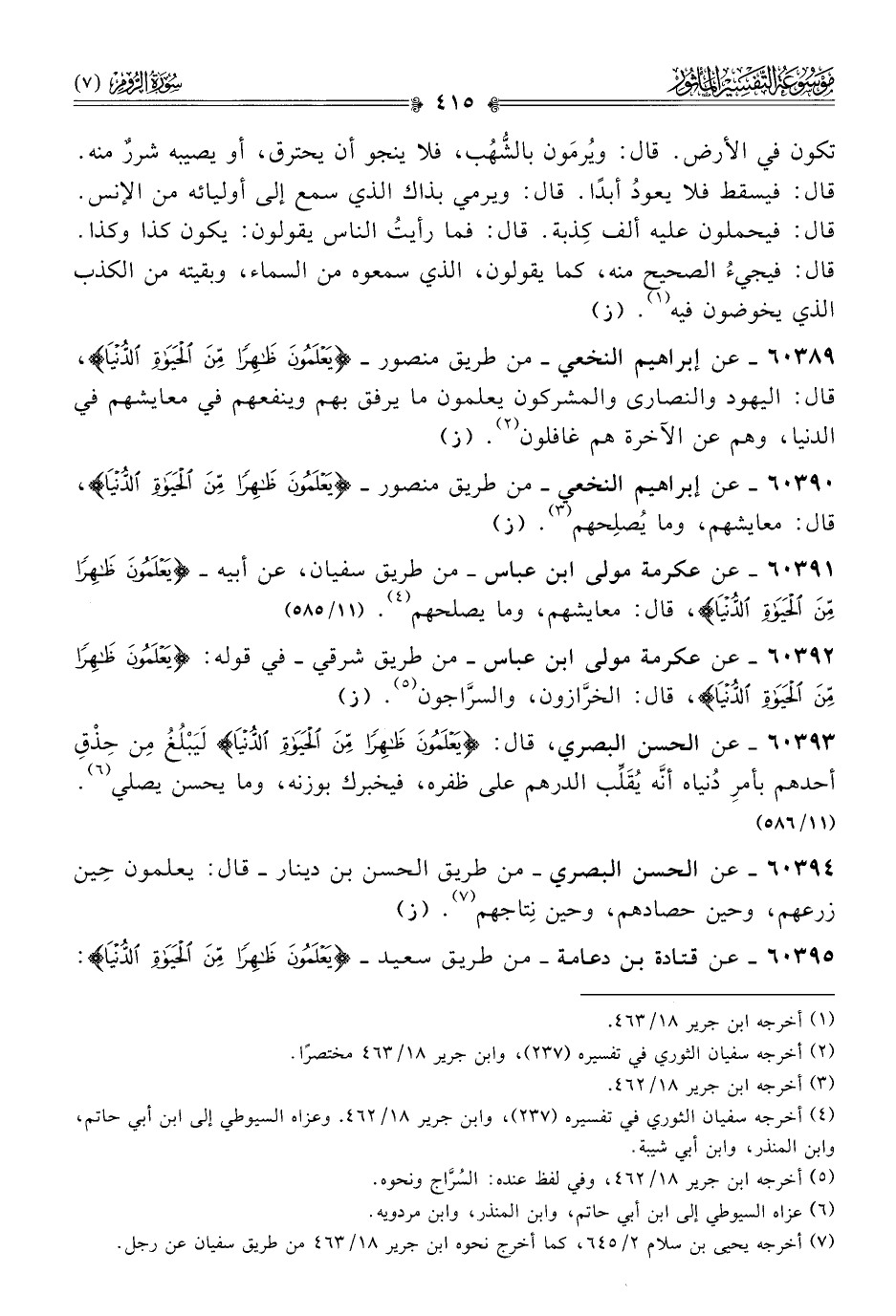 ٦٠٣٩٠ - عن إبراهيم النخعي -من طريق منصور- {يَعْلَمُونَ ظاهِرًا مِنَ الحَياةِ الدُّنْيا}، قال: معايشهم، وما يُصلِحهم (¬٣). (ز)