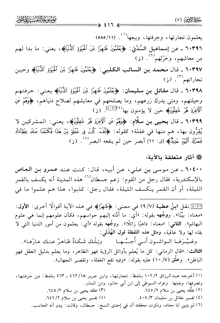 ٦٠٣٩٧ - قال محمد بن السائب الكلبي: {يَعْلَمُونَ ظاهِرًا مِنَ الحَياةِ الدُّنْيا} وحين تجاراتهم (¬٣). (ز)