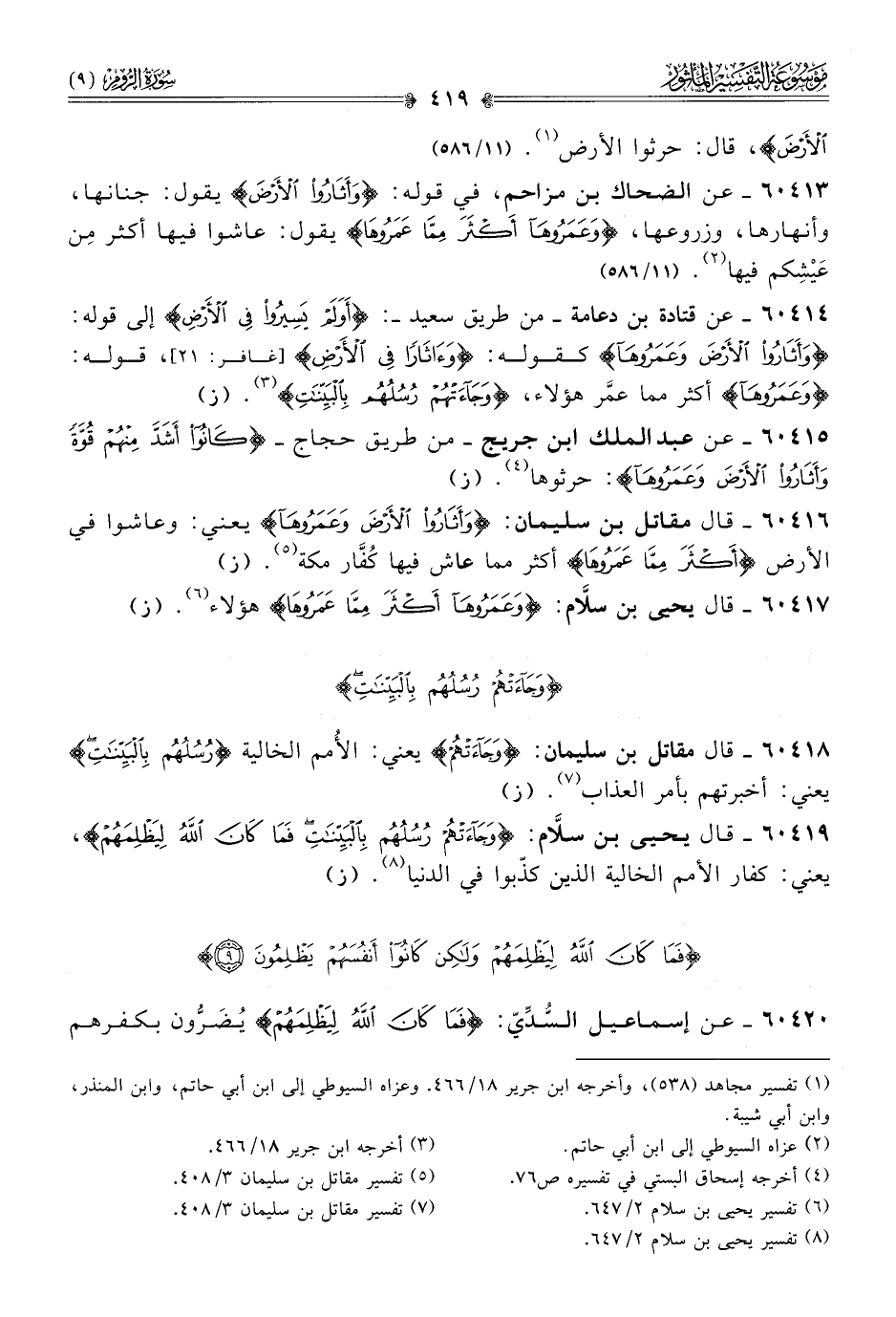 ٦٠٤١٤ - عن قتادة بن دعامة -من طريق سعيد-: {أوَلَمْ يَسِيرُوا في الأَرْضِ} إلى قوله: {وأَثارُوا الأَرْضَ وعَمَرُوها} كقوله: {وآثارًا في الأَرْضِ} [غافر: ٢١]، قوله: {وعَمَرُوها} أكثر مما عمَّر هؤلاء، {وجاءَتْهُمْ رُسُلُهُمْ بِالبَيِّناتِ} (¬٣). (ز)