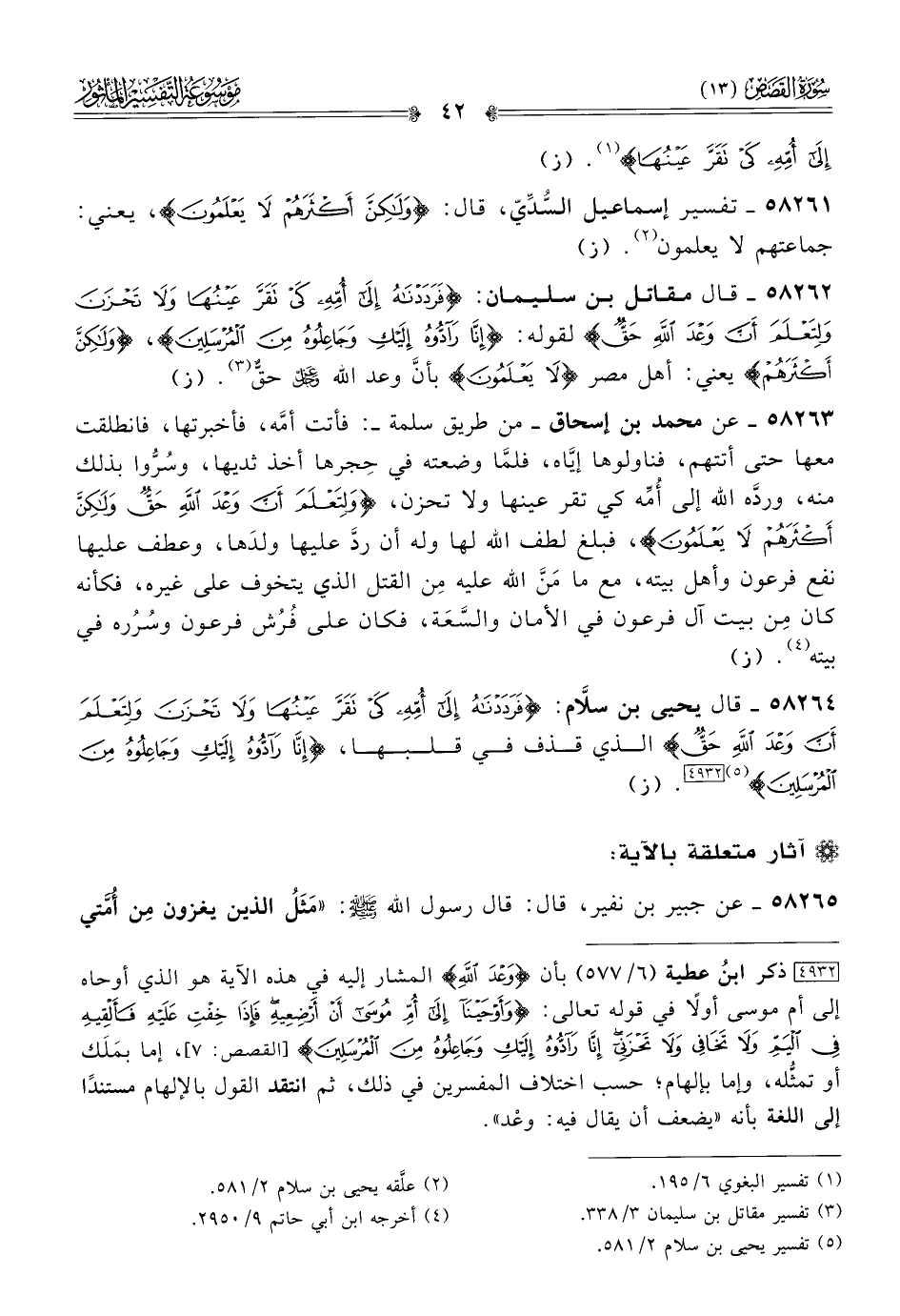 ٥٨٢٦٤ - قال يحيى بن سلّام: {فرددناه إلى أمه كي تقر عينها ولا تحزن ولتعلم أن وعد الله حق} الذي قذف في قلبها، {إنا رادوه إليك وجاعلوه من المرسلين} (¬٥) [٤٩٣٢]. (ز)