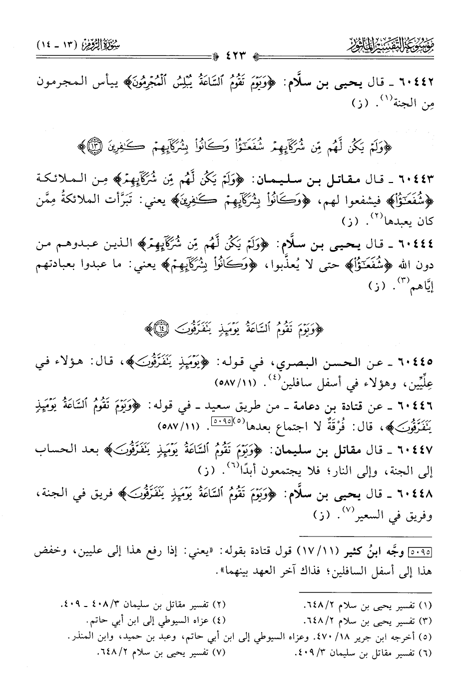 ٦٠٤٤٦ - عن قتادة بن دعامة -من طريق سعيد- في قوله: {ويَوْم تقوم السّاعَة يَوْمئِذٍ يتفرقون}، قال: فُرْقَةٌ لا اجتماع بعدها (¬٥) [٥٠٩٥]. (١١/ ٥٨٧)