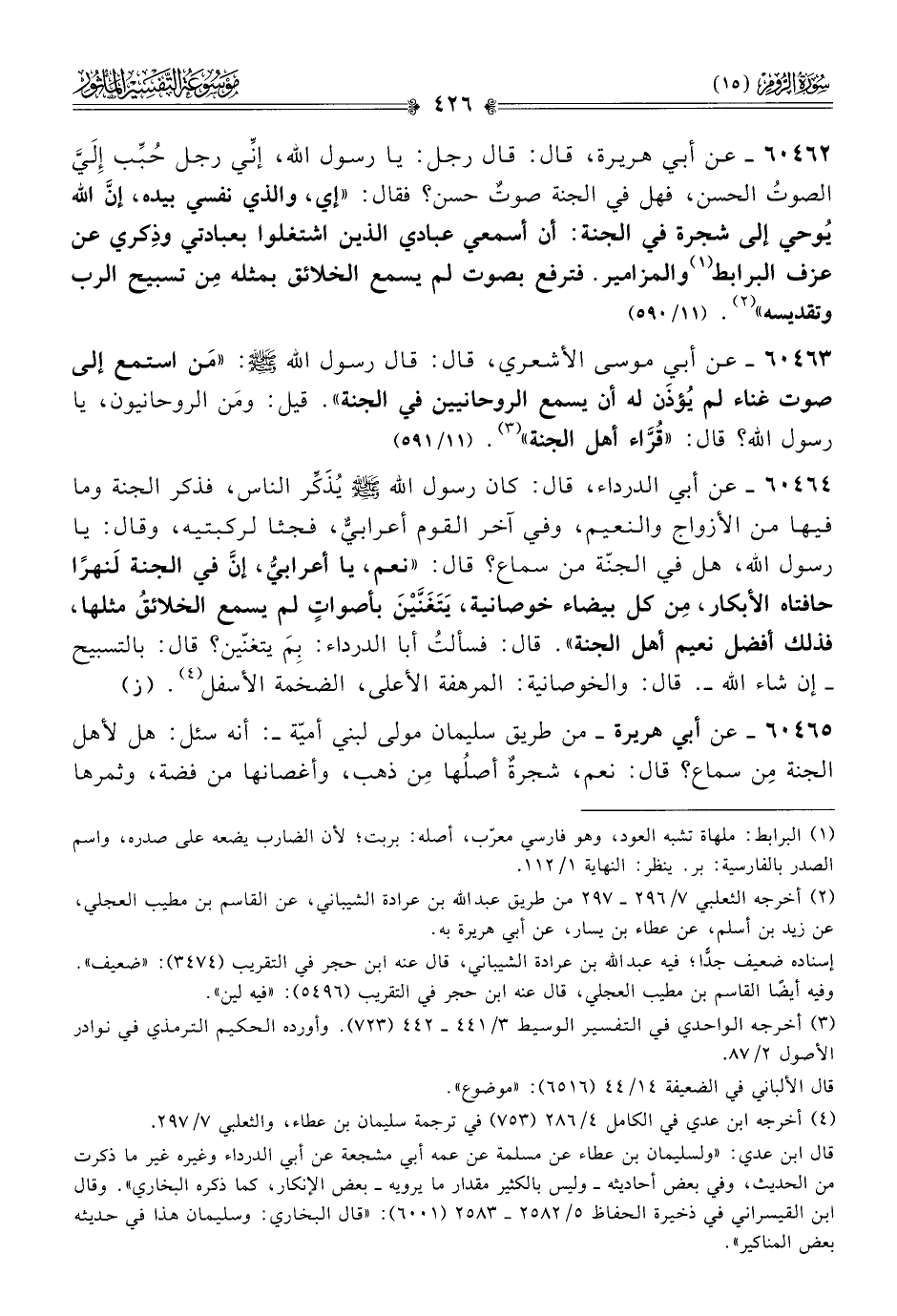 ٦٠٤٦٢ - عن أبي هريرة، قال: قال رجل: يا رسول الله، إنِّي رجل حُبِّب إلَيَّ الصوتُ الحسن، فهل في الجنة صوتٌ حسن؟ فقال: «إي، والذي نفسي بيده، إنّ الله يُوحي إلى شجرة في الجنة: أن أسمعي عبادي الذين اشتغلوا بعبادتي وذِكري عن عزف البرابط (¬١) والمزامير. فترفع بصوت لم يسمع الخلائق بمثله مِن تسبيح الرب وتقديسه» (¬٢). (١١/ ٥٩٠)