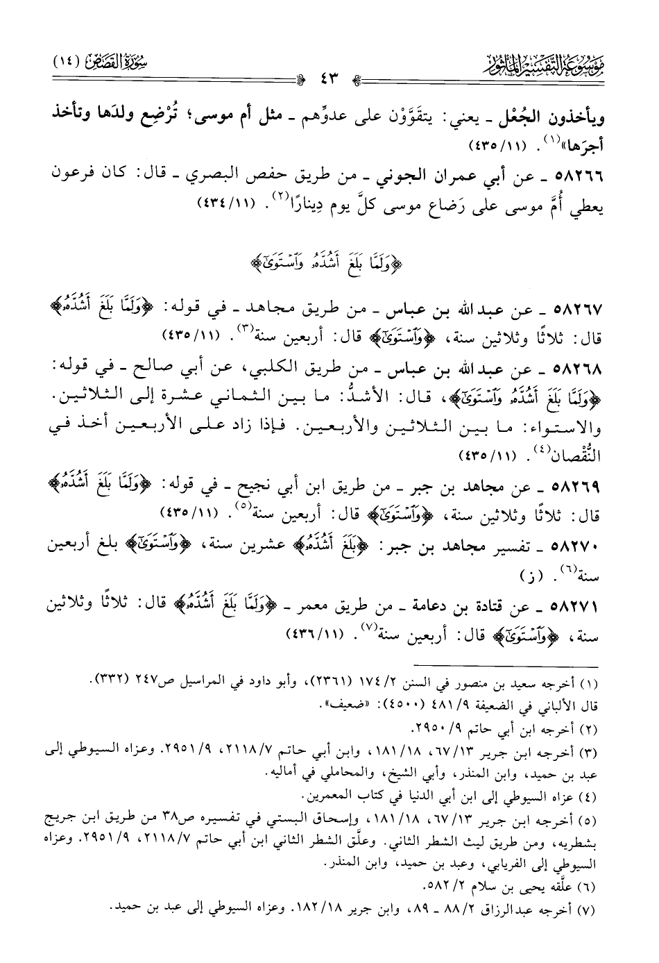 ٥٨٢٧٠ - تفسير مجاهد بن جبر: {بلغ أشده} عشرين سنة، {واستوى} بلغ أربعين سنة (¬٦). (ز)