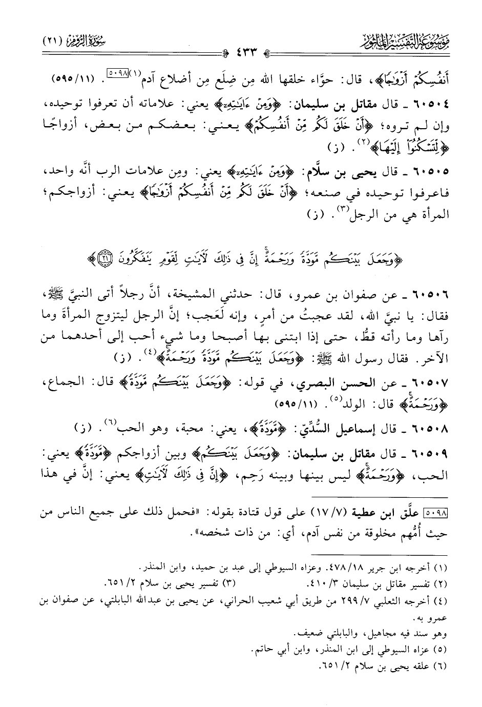٦٠٥٠٩ - قال مقاتل بن سليمان: {وجَعَلَ بَيْنَكُمْ} وبين أزواجكم {مَوَدَّةً} يعني: الحب، {ورَحْمَةً} ليس بينها وبينه رَحِم، {إنَّ في ذَلِكَ لَآياتٍ} يعني: إنّ في هذا