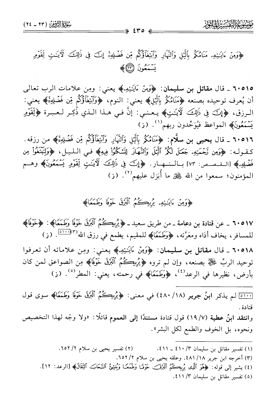 [٥١٠٠] لم يذكر ابنُ جرير (١٨/ ٤٨٠) في معنى: {يُرِيكُمُ البَرْقَ خَوْفًا وطَمَعًا} سوى قول قتادة.
