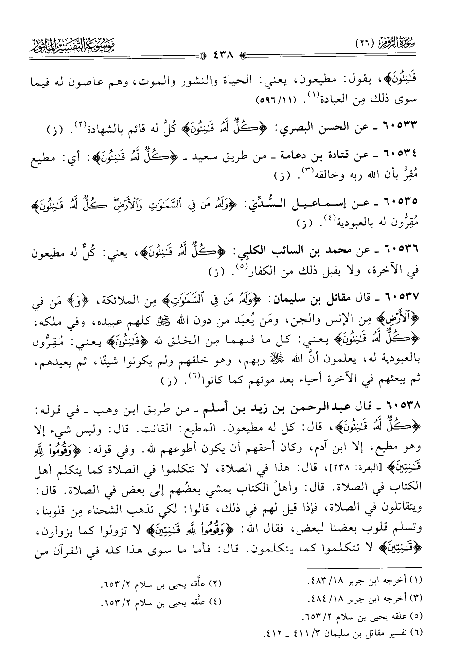 ٦٠٥٣٨ - قال عبد الرحمن بن زيد بن أسلم -من طريق ابن وهب- في قوله: {كُلٌّ لَهُ قانِتُونَ}، قال: كل له مطيعون. المطيع: القانت. قال: وليس شيء إلا وهو مطيع، إلا ابن آدم، وكان أحقهم أن يكون أطوعهم لله. وفي قوله: {وقُومُوا لِلَّهِ قانِتِينَ} [البقرة: ٢٣٨]، قال: هذا في الصلاة، لا تتكلموا في الصلاة كما يتكلم أهل الكتاب في الصلاة. قال: وأهلُ الكتاب يمشي بعضُهم إلى بعض في الصلاة. قال: ويتقاتلون في الصلاة، فإذا قيل لهم في ذلك، قالوا: لكي تذهب الشحناء مِن قلوبنا، وتسلم قلوب بعضنا لبعض، فقال الله: {وقُومُوا لِلَّهِ قانِتِينَ} لا تزولوا كما يزولون، {قانِتِينَ} لا تتكلموا كما يتكلمون. قال: فأما ما سوى هذا كله في القرآن من