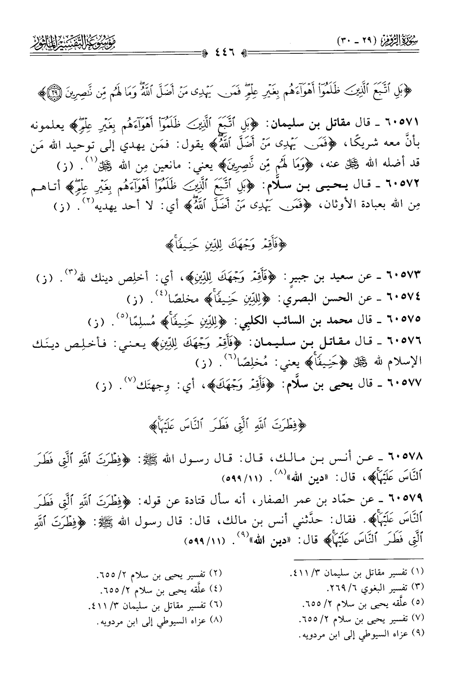 ٦٠٥٧٨ - عن أنس بن مالك، قال: قال رسول الله - صلى الله عليه وسلم -: {فطْرَة الله الَّتِي فطر النّاس عَلَيْها}، قال: «دين الله» (¬٨). (١١/ ٥٩٩)