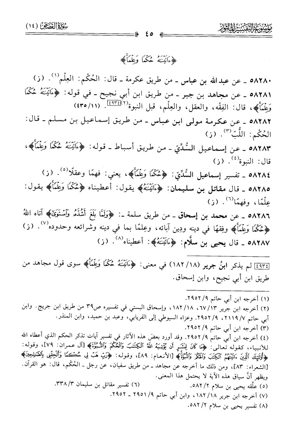 [٤٩٣٤] لم يذكر ابنُ جرير (١٨/ ١٨٢) في معنى: {آتَيْناهُ حُكْمًا وعِلْمًا} سوى قول مجاهد من طريق ابن أبي نجيح، وابن إسحاق.