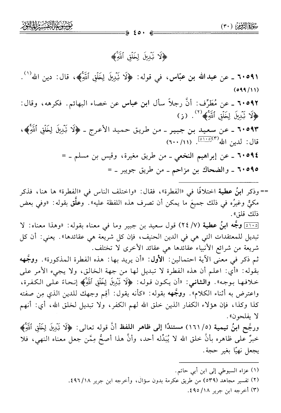 ٦٠٥٩١ - عن عبد الله بن عبّاس، في قوله: {لا تَبْدِيل لخلق الله}، قال: دين الله (¬١). (١١/ ٥٩٩)