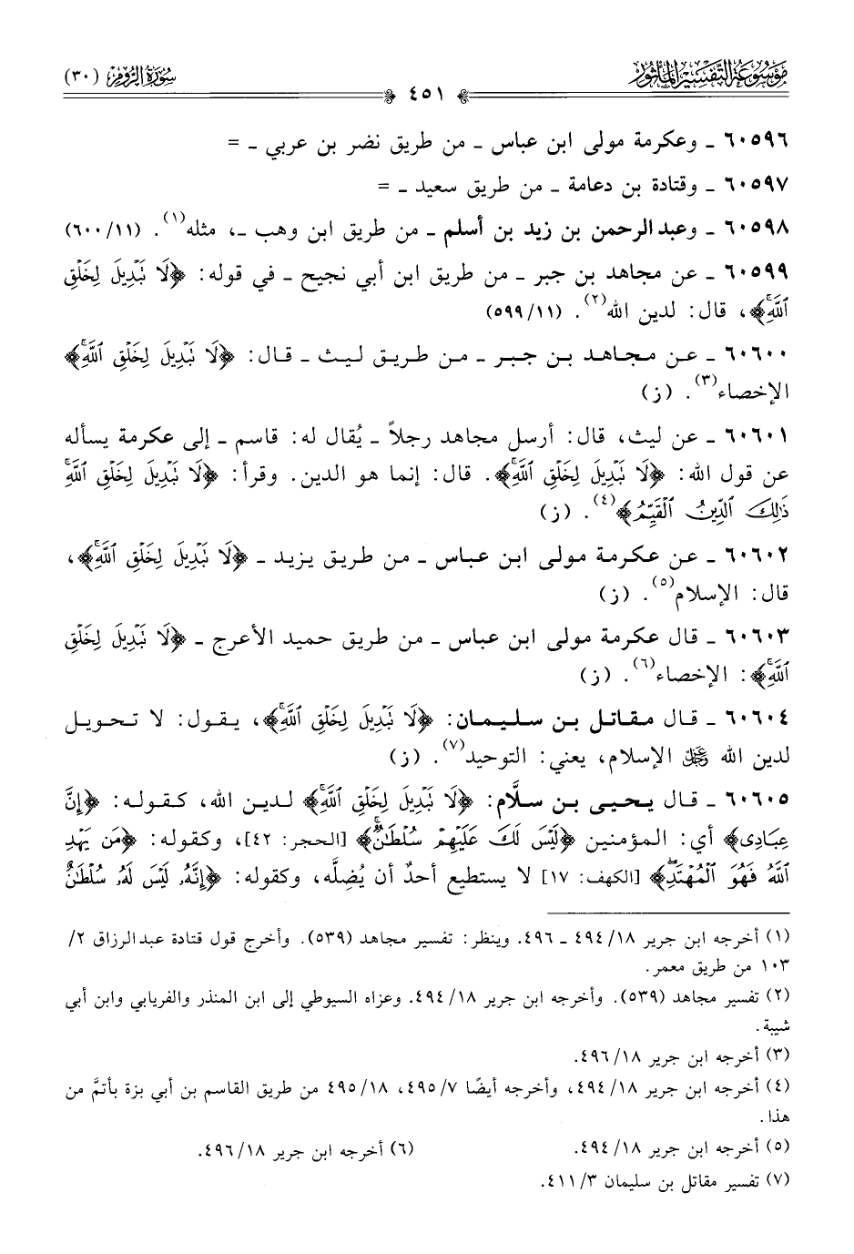 ٦٠٥٩٩ - عن مجاهد بن جبر -من طريق ابن أبي نجيح- في قوله: {لا تَبْدِيل لخلق الله}، قال: لدين الله (¬٢). (١١/ ٥٩٩)