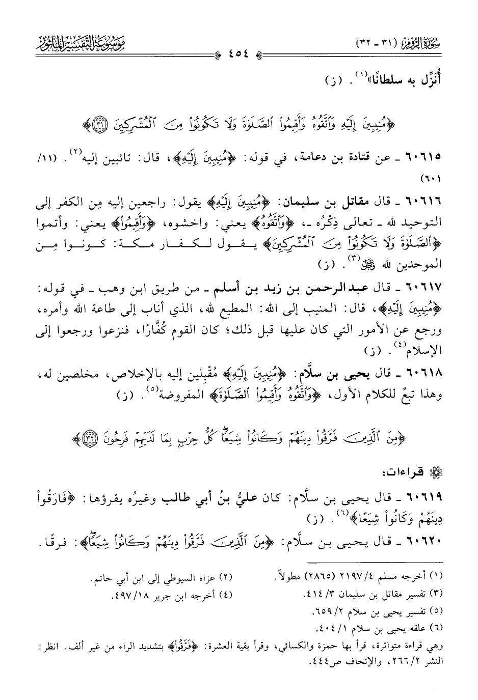 ٦٠٦١٨ - قال يحيى بن سلّام: {مُنِيبِينَ إلَيْهِ} مُقْبِلين إليه بالإخلاص، مخلصين له، وهذا تبعٌ للكلام الأول، {واتَّقُوهُ وأَقِيمُوا الصَّلاةَ} المفروضة (¬٥). (ز)