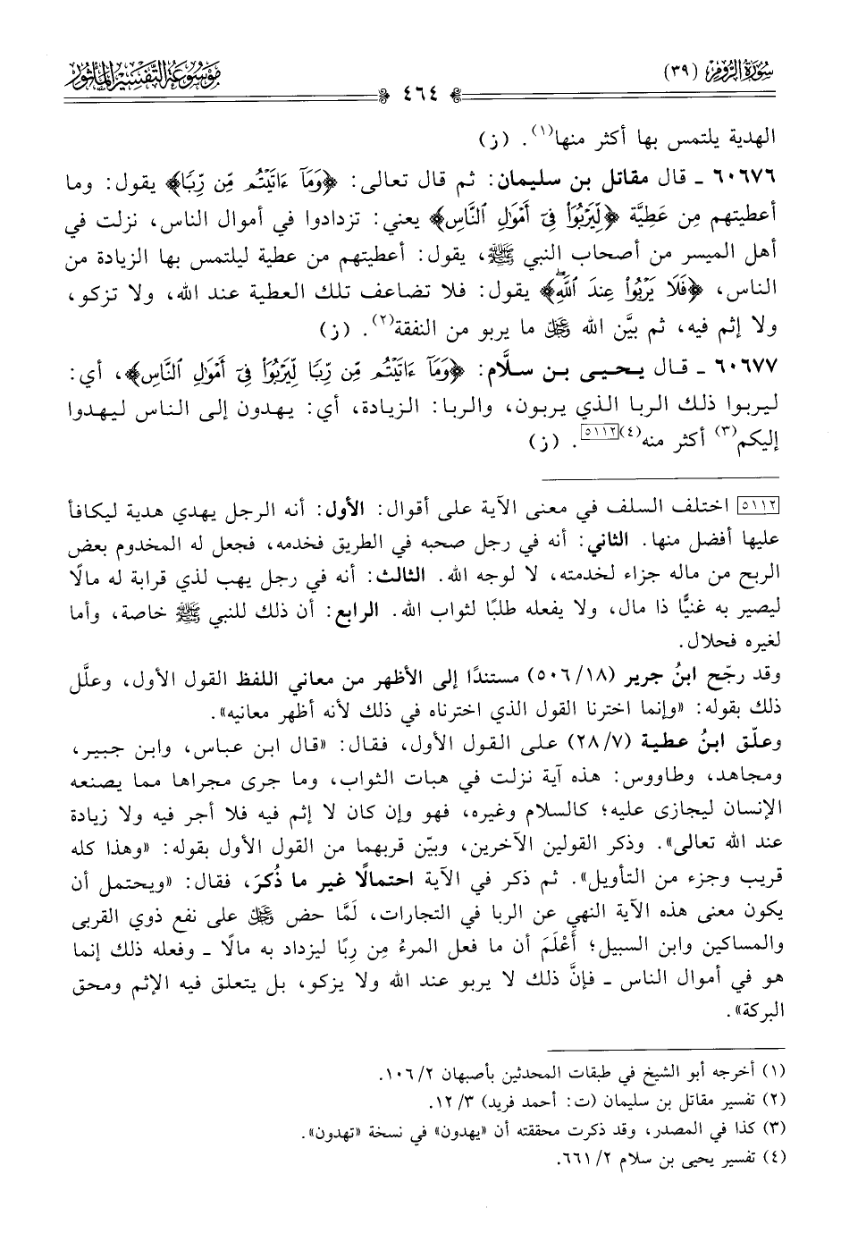 ٦٠٦٧٦ - قال مقاتل بن سليمان: ثم قال تعالى: {وما آتَيْتُمْ مِن رِبًا} يقول: وما أعطيتهم مِن عَطِيَّة {لِيَرْبُوَ فِي أمْوالِ النّاسِ} يعني: تزدادوا في أموال الناس، نزلت في أهل الميسر من أصحاب النبي - صلى الله عليه وسلم -، يقول: أعطيتهم من عطية ليلتمس بها الزيادة من الناس، {فَلا يَرْبُو عِنْدَ اللَّهِ} يقول: فلا تضاعف تلك العطية عند الله، ولا تزكو، ولا إثم فيه، ثم بين الله - عز وجل - ما يربو من النفقة (¬٢). (ز)