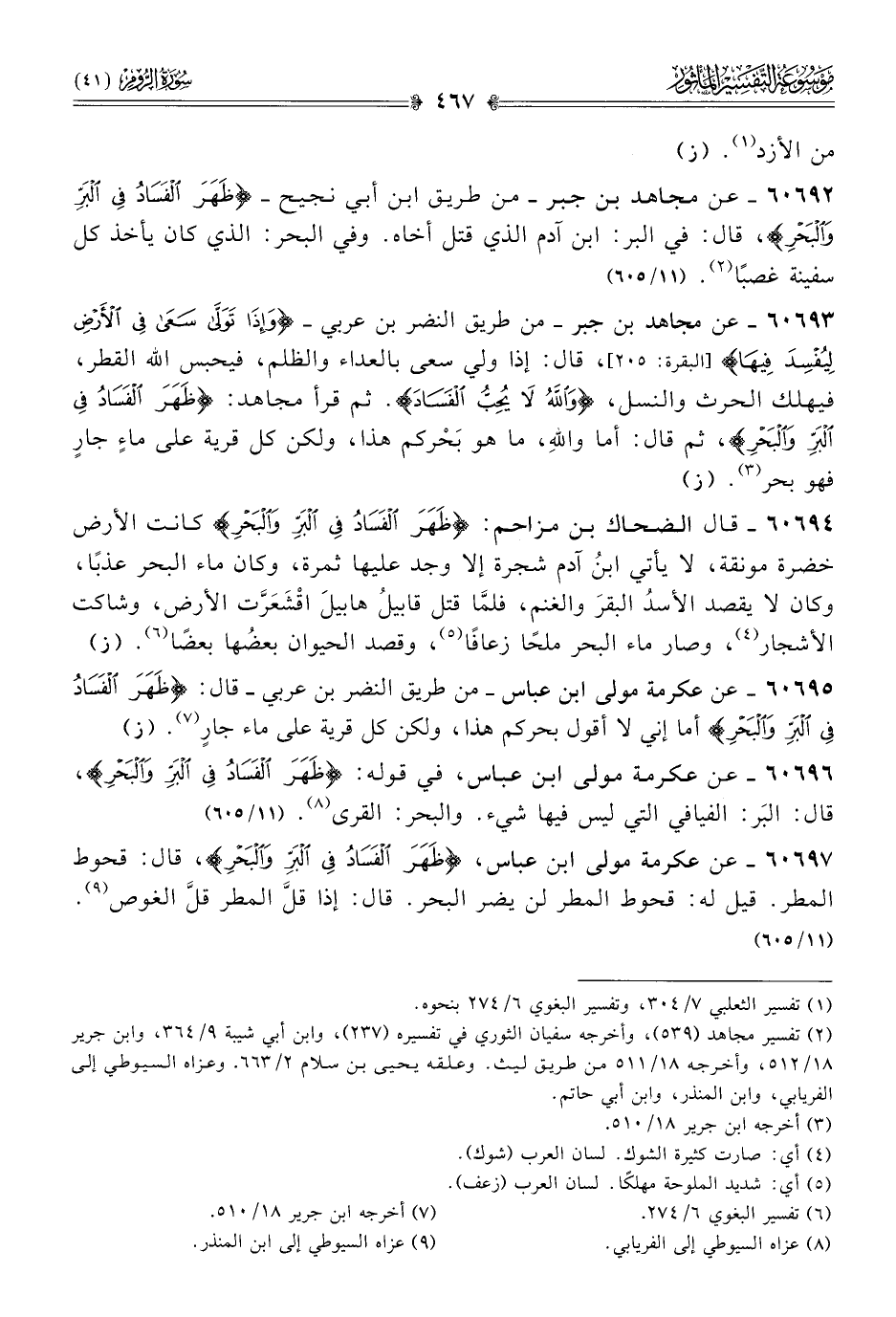 ٦٠٦٩٦ - عن عكرمة مولى ابن عباس، في قوله: {ظَهَرَ الفَسادُ فِي البَرِّ والبَحْرِ}، قال: البَر: الفيافي التي ليس فيها شيء. والبحر: القرى (¬٨). (١١/ ٦٠٥)