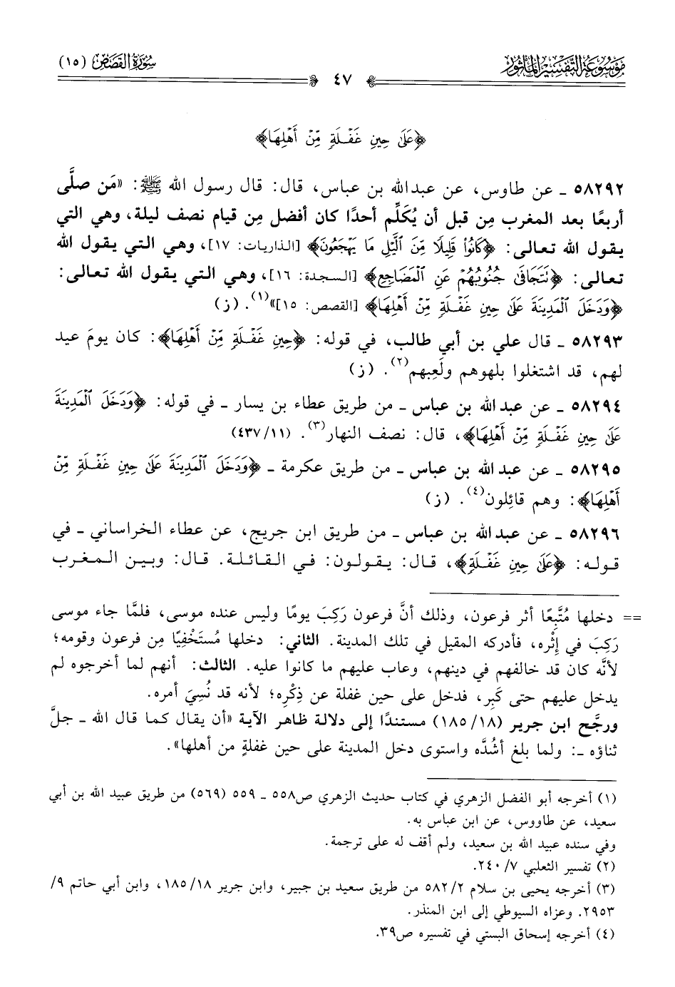 ٥٨٢٩٢ - عن طاوس، عن عبد الله بن عباس، قال: قال رسول الله - صلى الله عليه وسلم -: «مَن صلّى أربعًا بعد المغرب مِن قبل أن يُكَلِّم أحدًا كان أفضل مِن قيام نصف ليلة، وهي التي يقول الله تعالى: {كانوا قليلا من الليل ما يهجعون} [الذاريات: ١٧]، وهي التي يقول الله تعالى: {تتجافى جنوبهم عن المضاجع} [السجدة: ١٦]، وهي التي يقول الله تعالى: {ودخل المدينة على حين غفلة من أهلها} [القصص: ١٥]» (¬١). (ز)