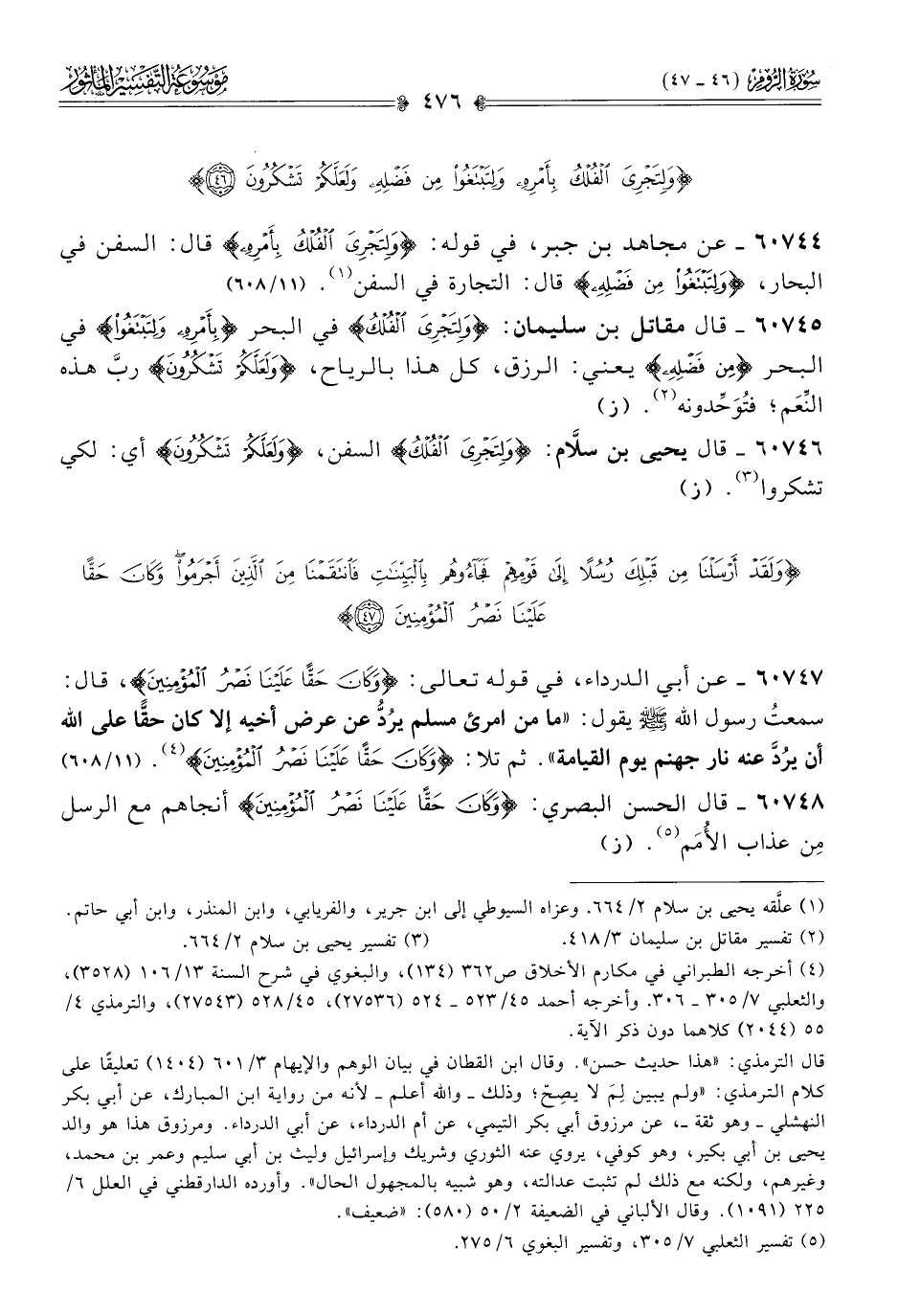 ٦٠٧٤٧ - عن أبي الدرداء، في قوله تعالى: {وكانَ حَقًّا عَلَيْنا نَصْرُ المُؤْمِنِينَ}، قال: سمعتُ رسول الله - صلى الله عليه وسلم - يقول: «ما من امرئ مسلم يرُدُّ عن عرض أخيه إلا كان حقًّا على الله أن يرُدَّ عنه نار جهنم يوم القيامة». ثم تلا: {وكانَ حَقًّا عَلَيْنا نَصْرُ المُؤْمِنِينَ} (¬٤). (١١/ ٦٠٨)