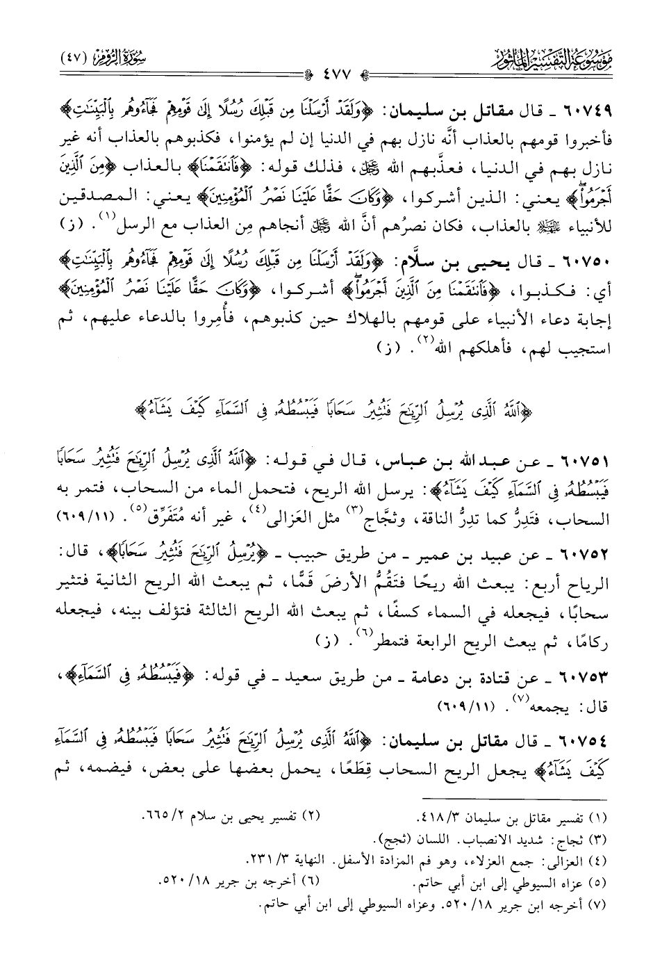 ٦٠٧٥٤ - قال مقاتل بن سليمان: {اللَّهُ الَّذِي يُرْسِلُ الرِّياحَ فَتُثِيرُ سَحابًا فَيَبْسُطُهُ فِي السَّماءِ كَيْفَ يَشاءُ} يجعل الريح السحاب قِطَعًا، يحمل بعضها على بعض، فيضمه، ثم