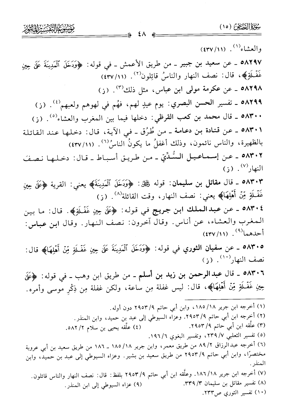 ٥٨٣٠٥ - عن سفيان الثوري في قوله: {ودخل المدينة على حين غفلة من أهلها} قال: نصف النهار (¬١٠). (ز)