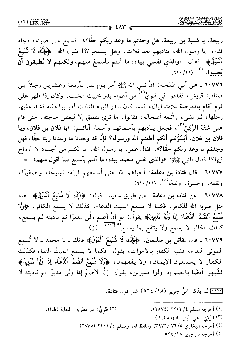 ربيعة، يا شيبة بن ربيعة، هل وجدتم ما وعد ربكم حقًّا؟». فسمع عمر صوته، فجاء فقال: يا رسول الله، تناديهم بعد ثلاث، وهل يسمعون؟! يقول الله: {فَإنَّكَ لا تُسْمِعُ المَوْتى}. فقال: «والذي نفسي بيده، ما أنتم بأسمعَ منهم، ولكنهم لا يُطيقون أن يُجيبوا» (¬١).