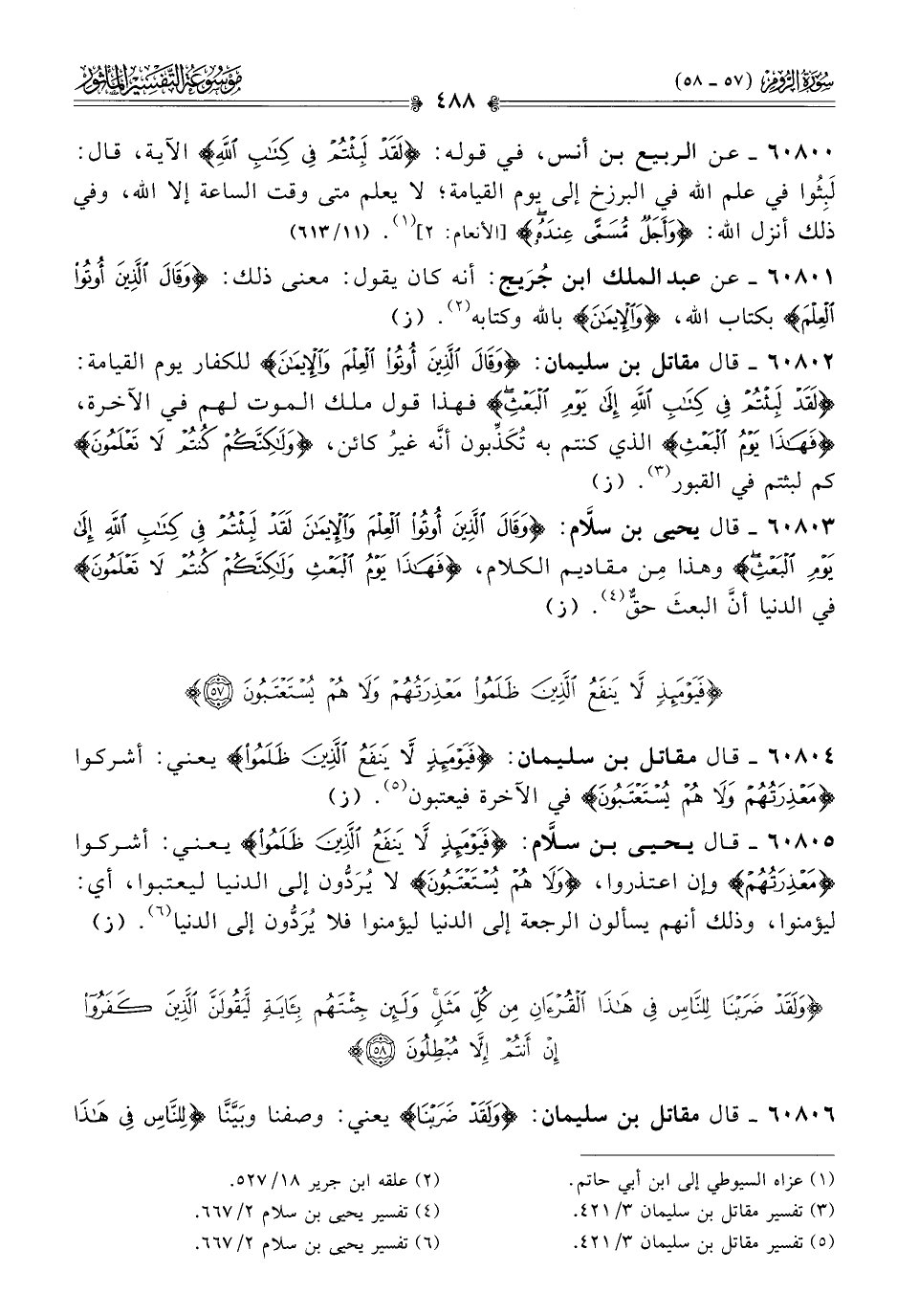 ٦٠٨٠٠ - عن الربيع بن أنس، في قوله: {لَقَدْ لَبِثْتُمْ فِي كِتابِ اللَّهِ} الآية، قال: لَبِثُوا في علم الله في البرزخ إلى يوم القيامة؛ لا يعلم متى وقت الساعة إلا الله، وفي ذلك أنزل الله: {وأجلٌ مُسَمًى عِندَهُ} [الأنعام: ٢] (¬١). (١١/ ٦١٣)