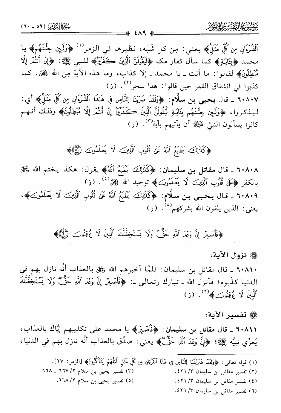 ٦٠٨١٠ - قال مقاتل بن سليمان: فلمّا أخبرهم الله - عز وجل - بالعذاب أنّه نازل بهم في الدنيا كذّبوه؛ فأنزل الله -تبارك وتعالى-: {فاصْبِرْ إنَّ وعْدَ اللَّهِ حَقٌّ ولا يَسْتَخِفَّنَّكَ الَّذِينَ لا يُوقِنُونَ} (¬٦). (ز)