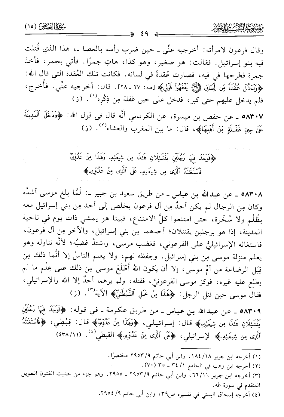 ٥٨٣٠٨ - عن عبد الله بن عباس -من طريق سعيد بن جبير-: لَمّا بلغ موسى أشدَّه وكان مِن الرجال لم يكن أحدٌ مِن آل فرعون يخلص إلى أحد مِن بني إسرائيل معه بظُلْم ولا سُخْرة، حتى امتنعوا كلَّ الامتناع، فبينا هو يمشي ذات يوم في ناحية المدينة، إذا هو برجلين يقتتلان؛ أحدهما مِن بني إسرائيل، والآخر مِن آل فرعون، فاستغاثه الإسرائيليُّ على الفرعوني، فغضب موسى، واشتدَّ غضبُه؛ لأنّه تناوله وهو يعلم منزلة موسى مِن بني إسرائيل، وحِفظه لهم، ولا يعلم الناسُ إلا أنّما ذلك مِن قِبَل الرضاعة من أمِّ موسى، إلا أن يكون اللهُ أطْلَعَ موسى مِن ذلك على عِلْم ما لم يطلع عليه غيره، فوكز موسى الفرعونيَّ، فقتله، ولم يرهما أحدٌ إلا الله والإسرائيلي، فقال موسى حين قتل الرجل: {هذا من عمل الشيطان} الآية (¬٣). (ز)