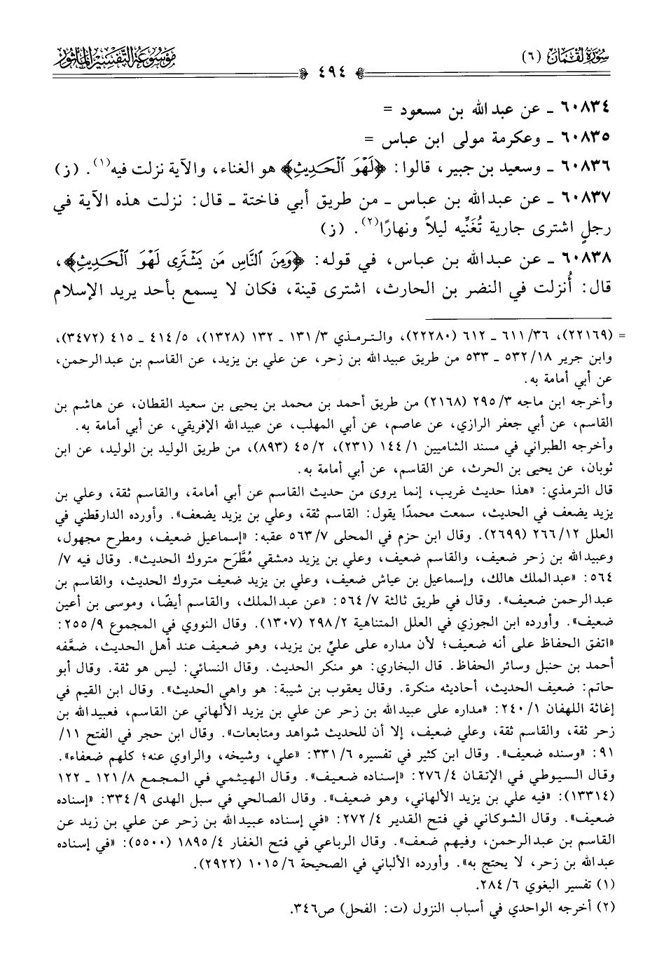 ٦٠٨٣٦ - وسعيد بن جبير، قالوا: {لَهْوَ الحَدِيثِ} هو الغناء، والآية نزلت فيه (¬١). (ز)