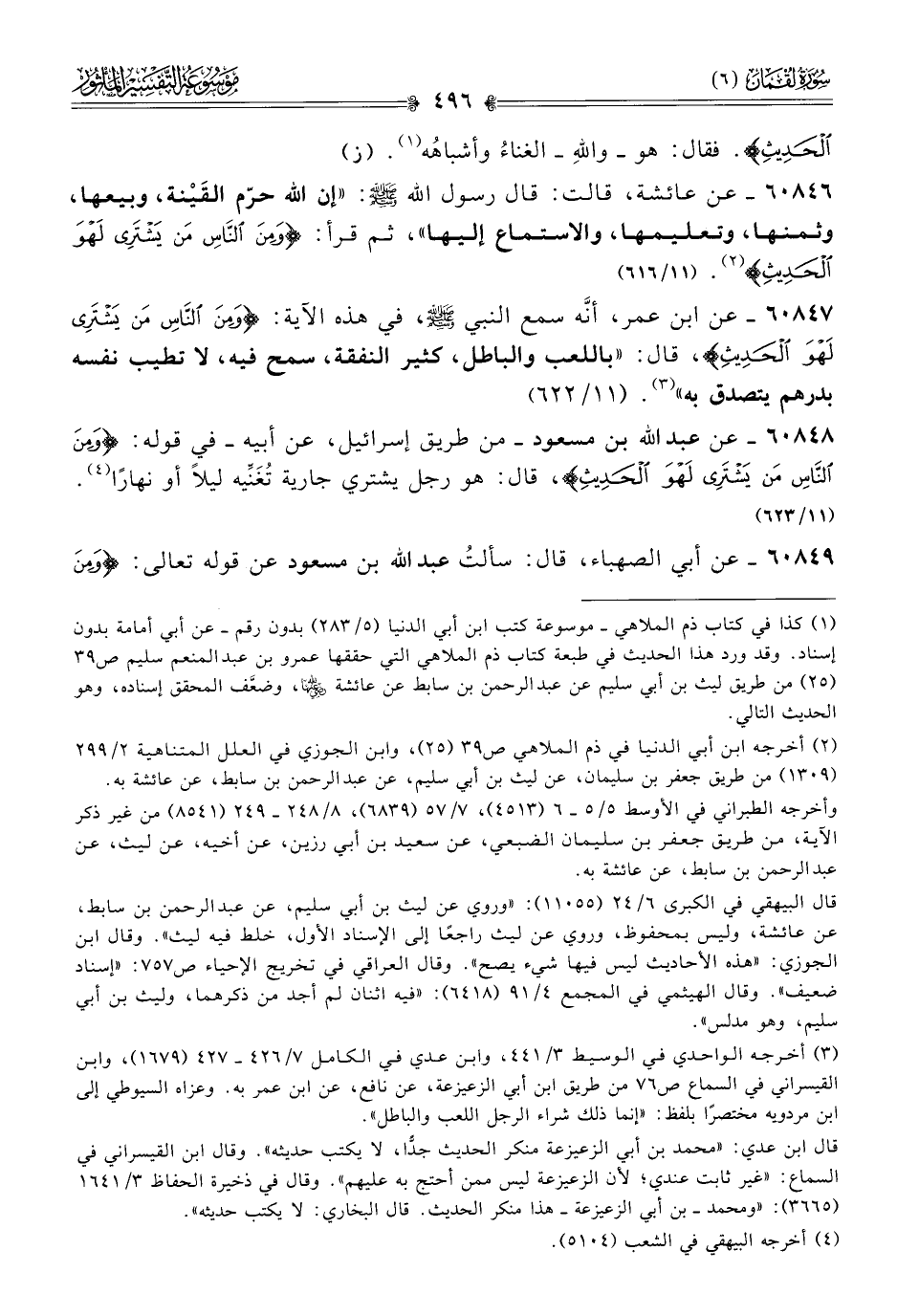 ٦٠٨٤٨ - عن عبد الله بن مسعود -من طريق إسرائيل، عن أبيه- في قوله: {ومِنَ النّاسِ مَن يَشْتَرِي لَهْوَ الحَدِيثِ}، قال: هو رجل يشتري جارية تُغَنِّيه ليلًا أو نهارًا (¬٤). (١١/ ٦٢٣)