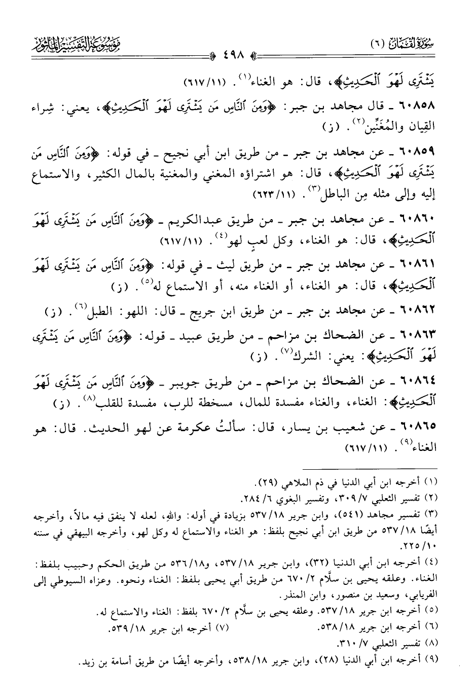 ٦٠٨٥٨ - قال مجاهد بن جبر: {ومِنَ النّاسِ مَن يَشْتَرِي لَهْوَ الحَدِيثِ}، يعني: شِراء القِيان والمُغَنِّين (¬٢). (ز)