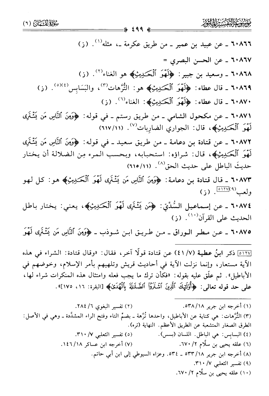 ٦٠٨٧٣ - قال قتادة بن دعامة: {ومِنَ النّاسِ مَن يَشْتَرِي لَهْوَ الحَدِيثِ} هو كل لهو ولعب (¬٩) [٥١٢٧]. (ز)