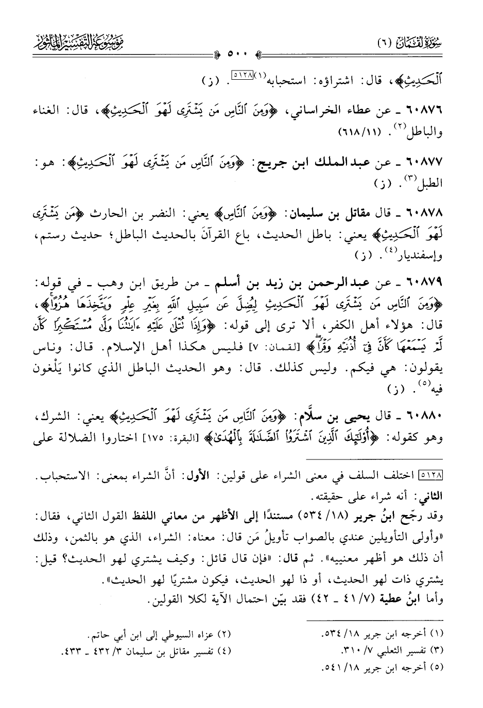 ٦٠٨٨٠ - قال يحيى بن سلّام: {ومِن النّاسِ مَن يَشْتَرِي لَهْوَ الحَدِيثِ} يعني: الشرك، وهو كقوله: {أولئك الذين اشتروا الضلالة بالهدى} [البقرة: ١٧٥] اختاروا الضلالة على