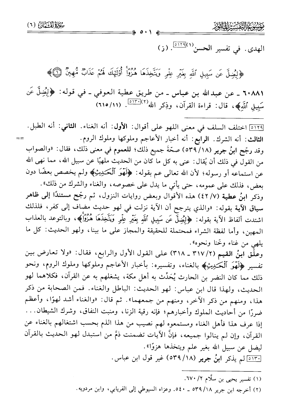 [٥١٢٩] اختلف السلف في معنى اللهو على أقوال: الأول: أنه الغناء. الثاني: أنه الطبل. الثالث: أنه الشرك. الرابع: أنه أخبار الأعاجم وملوكها وملوك الروم.