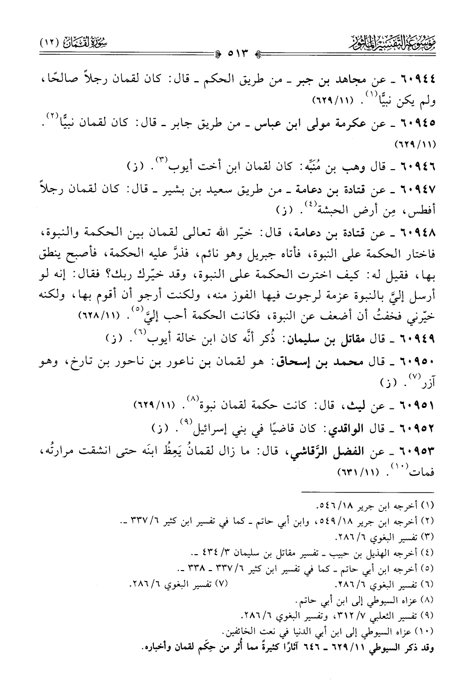 (¬١٠) عزاه السيوطي إلى ابن أبي الدنيا في نعت الخائفين. وقد ذكر السيوطي ١١/ ٦٢٩ - ٦٤٦ آثارًا كثيرةً مما أُثر من حِكَم لقمان وأخباره.