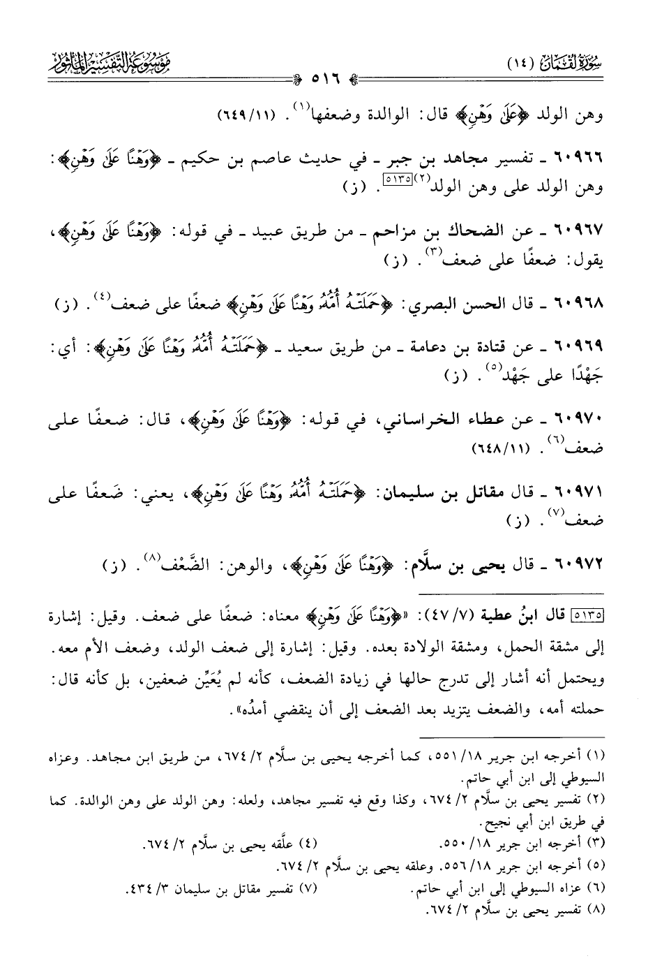 ٦٠٩٦٨ - قال الحسن البصري: {حَمَلَتْهُ أُمُّهُ وهْنًا عَلى وهْنٍ} ضعفًا على ضعف (¬٤). (ز)