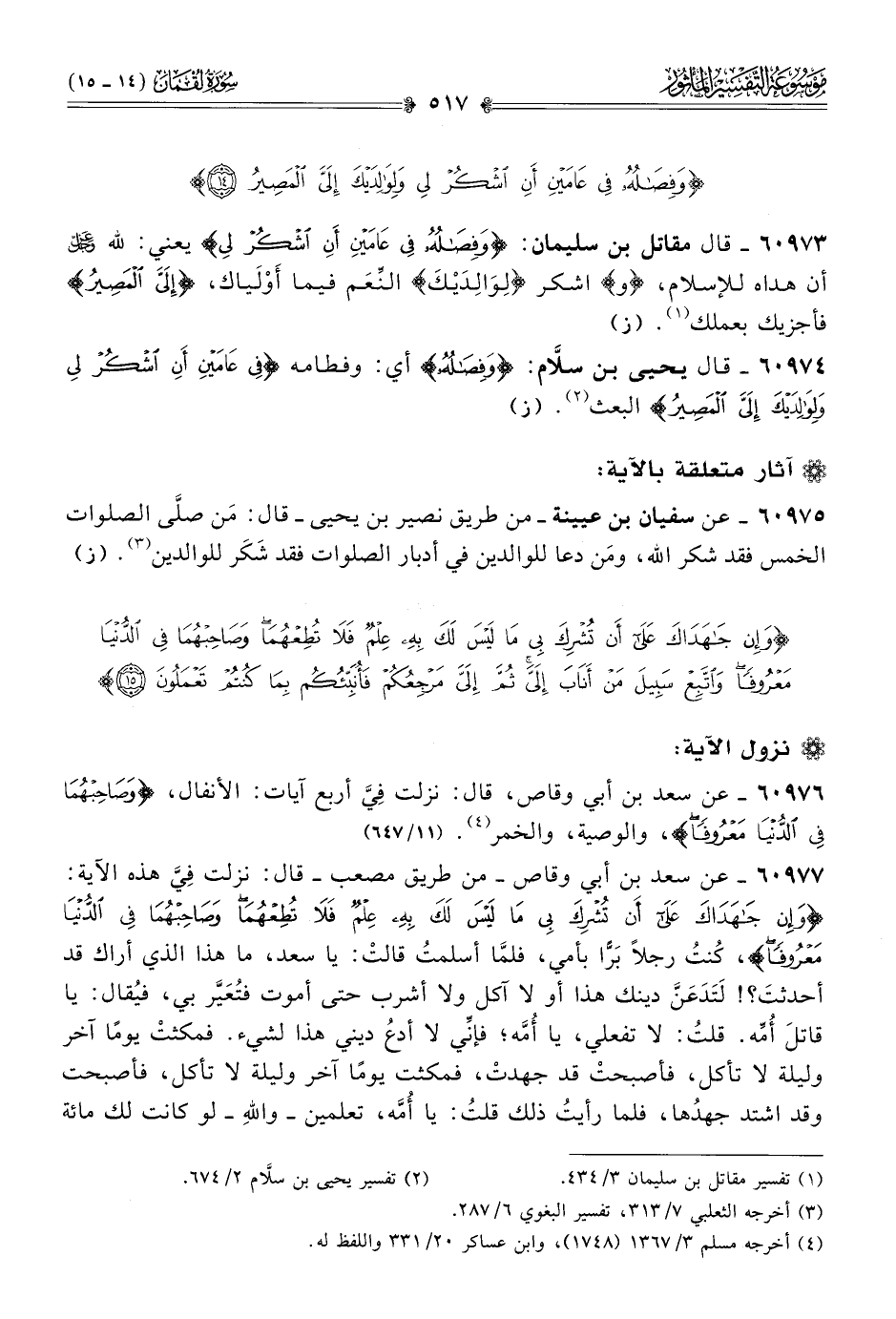 ٦٠٩٧٦ - عن سعد بن أبي وقاص، قال: نزلت فِيَّ أربع آيات: الأنفال، و {صاحِبْهُما فِي الدُّنْيا مَعْرُوفًا}، والوصية، والخمر (¬٤). (١١/ ٦٤٧)