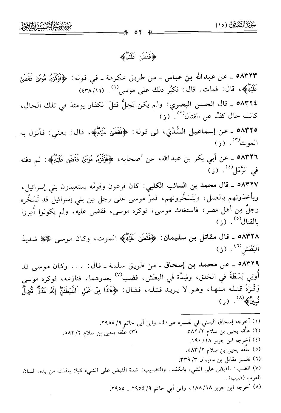 ٥٨٣٢٨ - قال مقاتل بن سليمان: {فقضى عليه} الموت، وكان موسى - عليه السلام - شديدَ البَطْشِ (¬٦). (ز)
