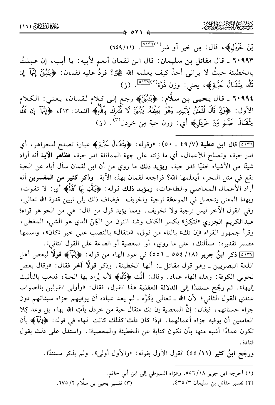 [٥١٣٧] ذكر ابنُ جرير (١٨/ ٥٥٤ - ٥٥٦) في عود الهاء من قوله: {إنها} قولًا لبعض أهل اللغة البصريين -وهو قول مقاتل-: أنها الخطيئة. وذكر قولًا آخر فقال: «وقال بعض نحويي الكوفة: وهذه الهاء عماد. وقال: أنّث {تك} لأنه يُراد بها الحبة، فذهب بالتأنيث إليها». ثم رجّح مستندًا إلى الدلالة العقلية هذا القول، فقال: «وأولى القولين بالصواب عندي القول الثاني؛ لأن الله -تعالى ذِكْرُه- لم يعد عباده أن يوفيهم جزاء سيئاتهم دون جزاء حسناتهم، فيقال: إنّ المعصية إن تك مثقال حبة من خردل يأتِ الله بها، بل وعد كِلا العاملين أن يوفيه جزاء أعمالهما. فإذا كان ذلك كذلك كانت الهاء في قوله: {إنها} بأن تكون عمادًا أشبه منها بأن تكون كناية عن الخطيئة والمعصية». واستدل على ذلك بقول قتادة.
